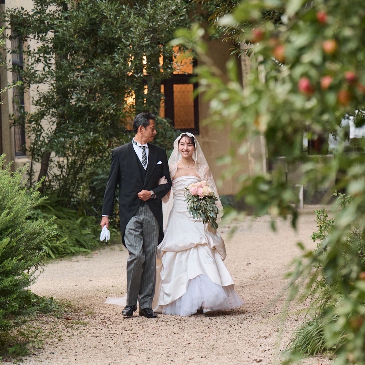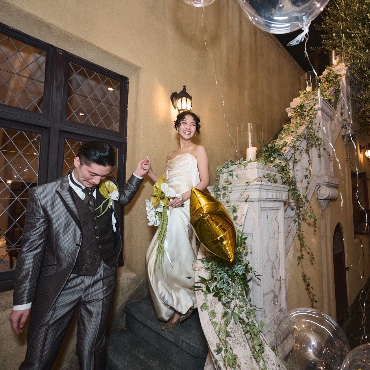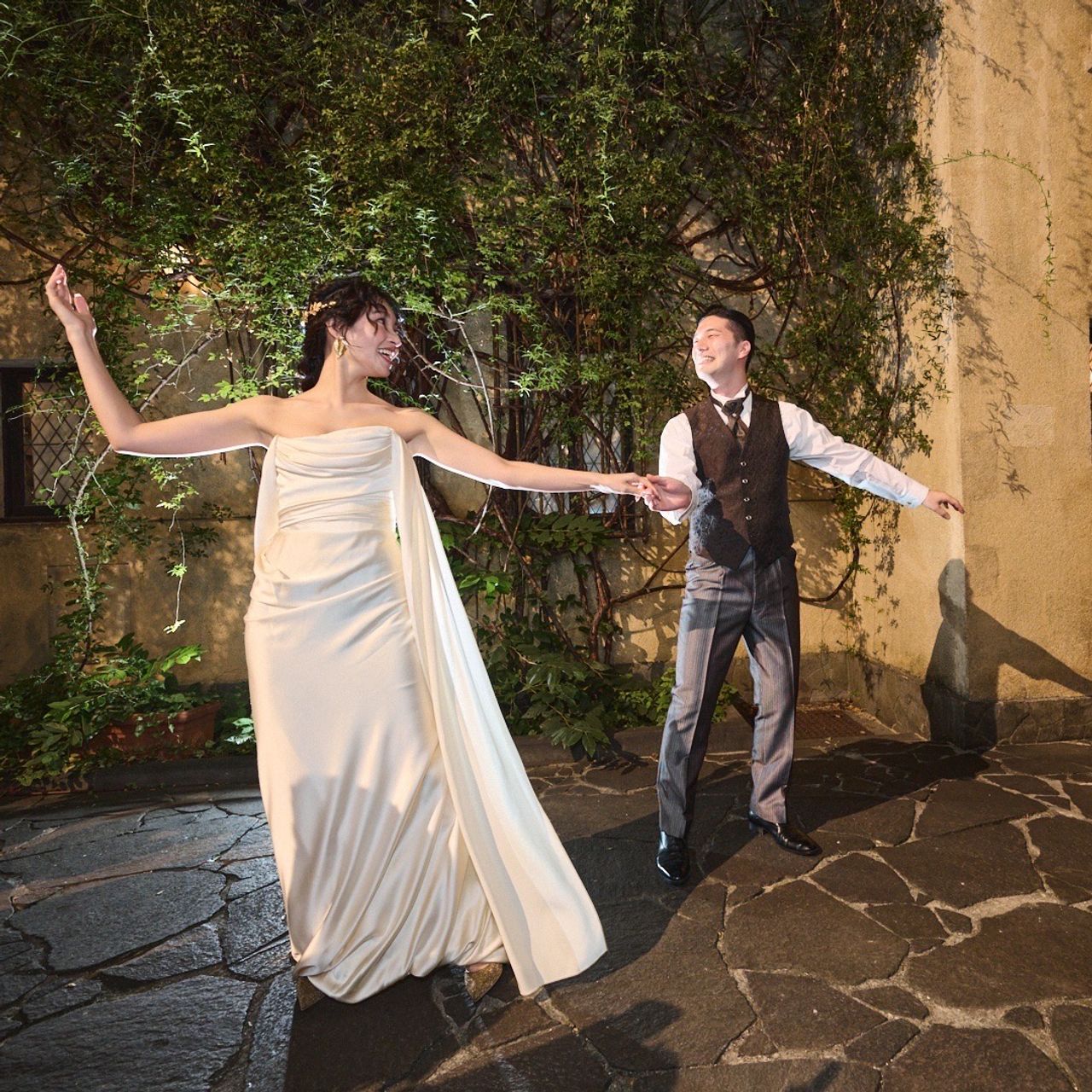10月の午後式なので、挙式開始時は明るく建築の外観や草花が良く見えます。挙式終了時には日が落ちて、高揚感のあるパーティーモードに切り替わるところが魅力的です。