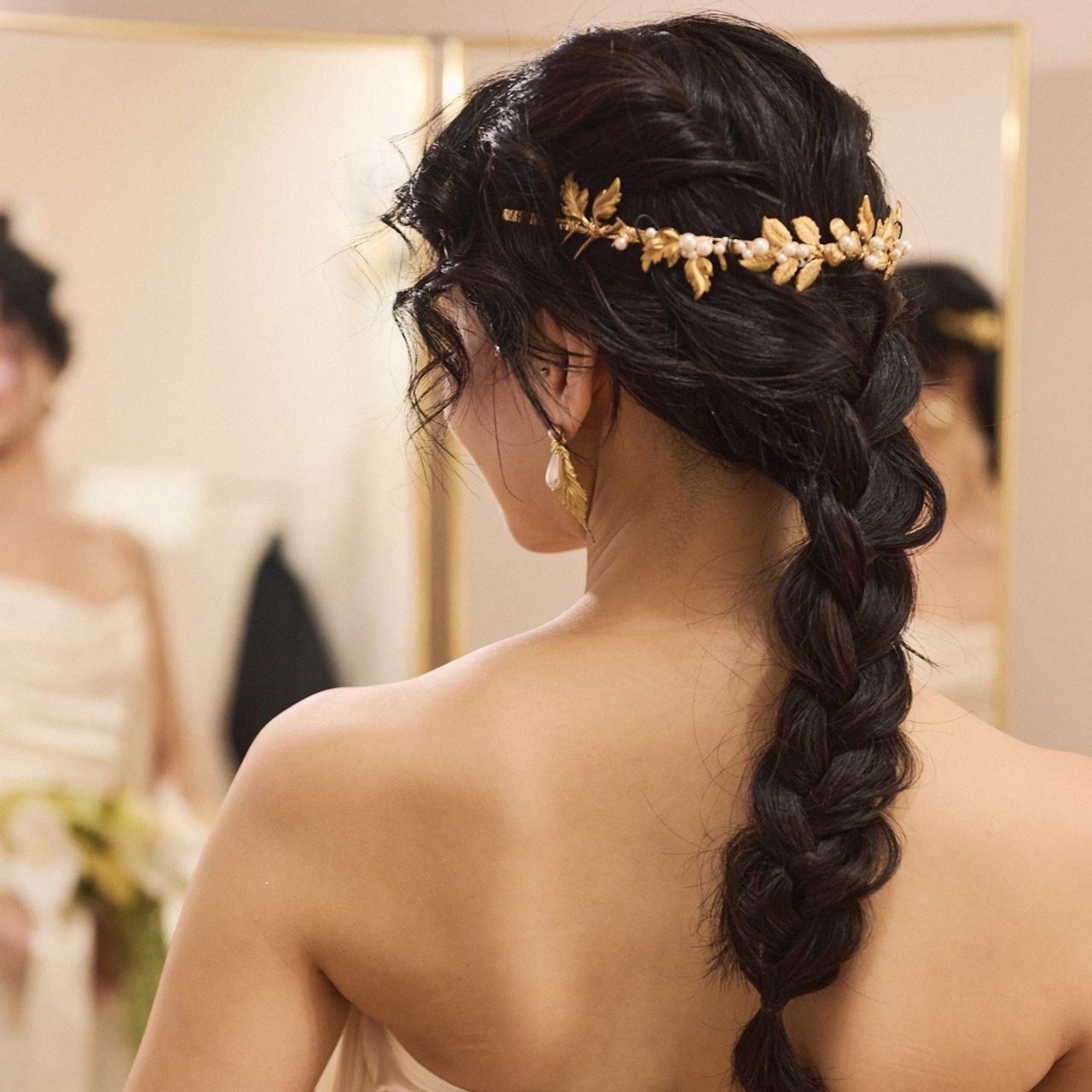 高貴な雰囲気を纏うドレスだったので、1着目とがらりとイメージを変えてギリシャの女神風スタイリングにしました。