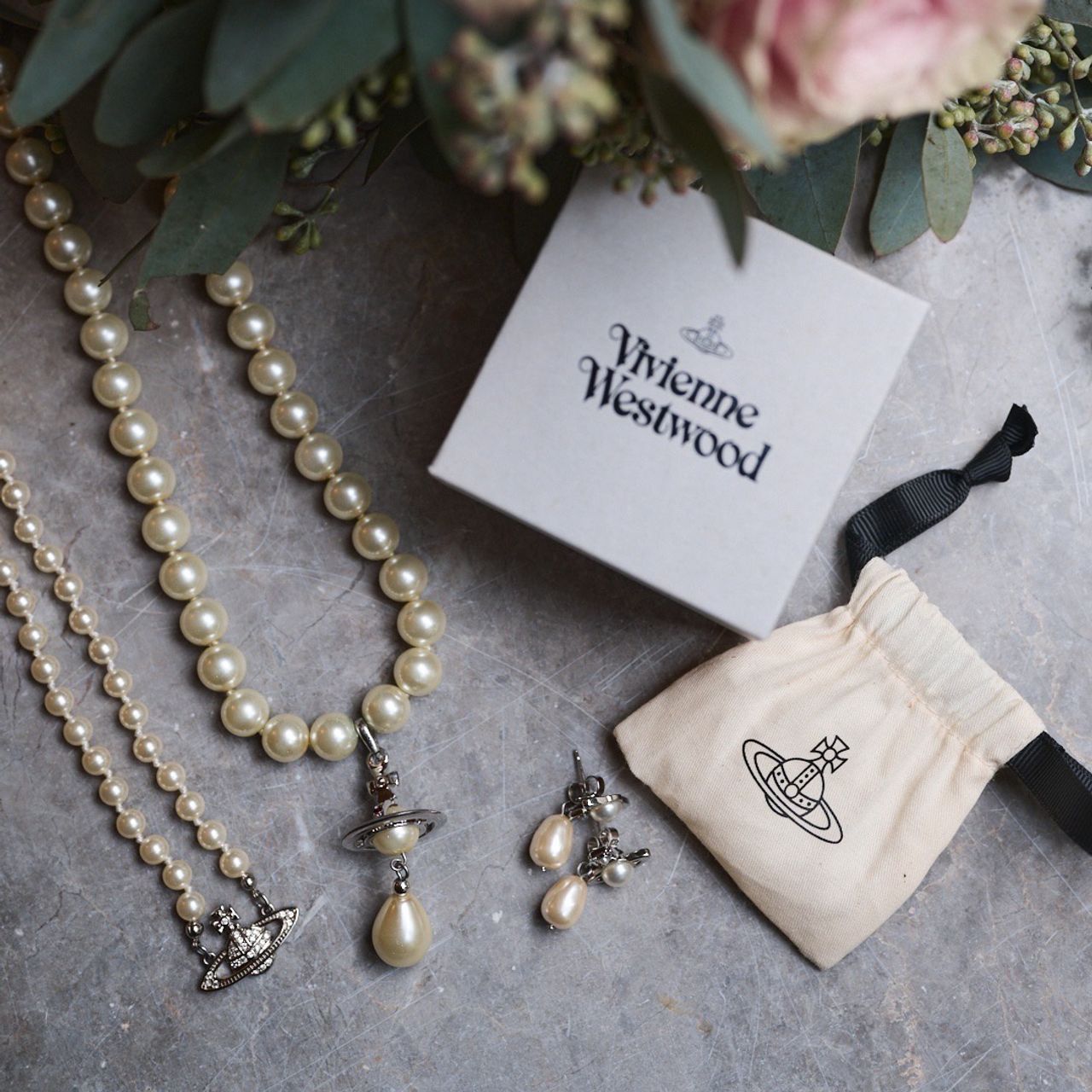 ドレスに合わせたVivienne Westwoodのピアスとネックレスです。
