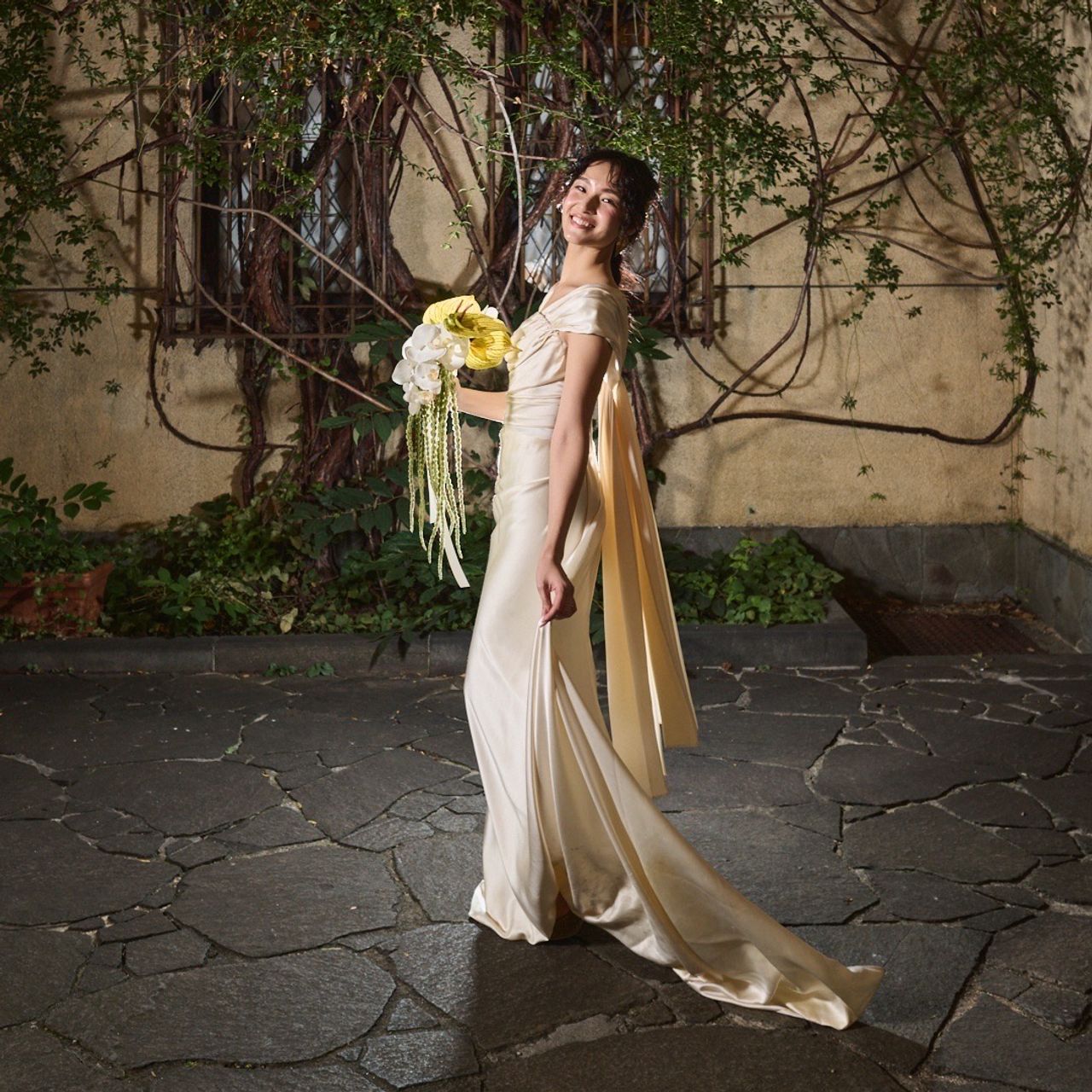 このドレープを出すのに、当日はショップのオーナーさんにも会場入りしてもらいドレスを着た後にひとつひとつ縫い上げていくという、時間と労のかかる仕上がりです。
