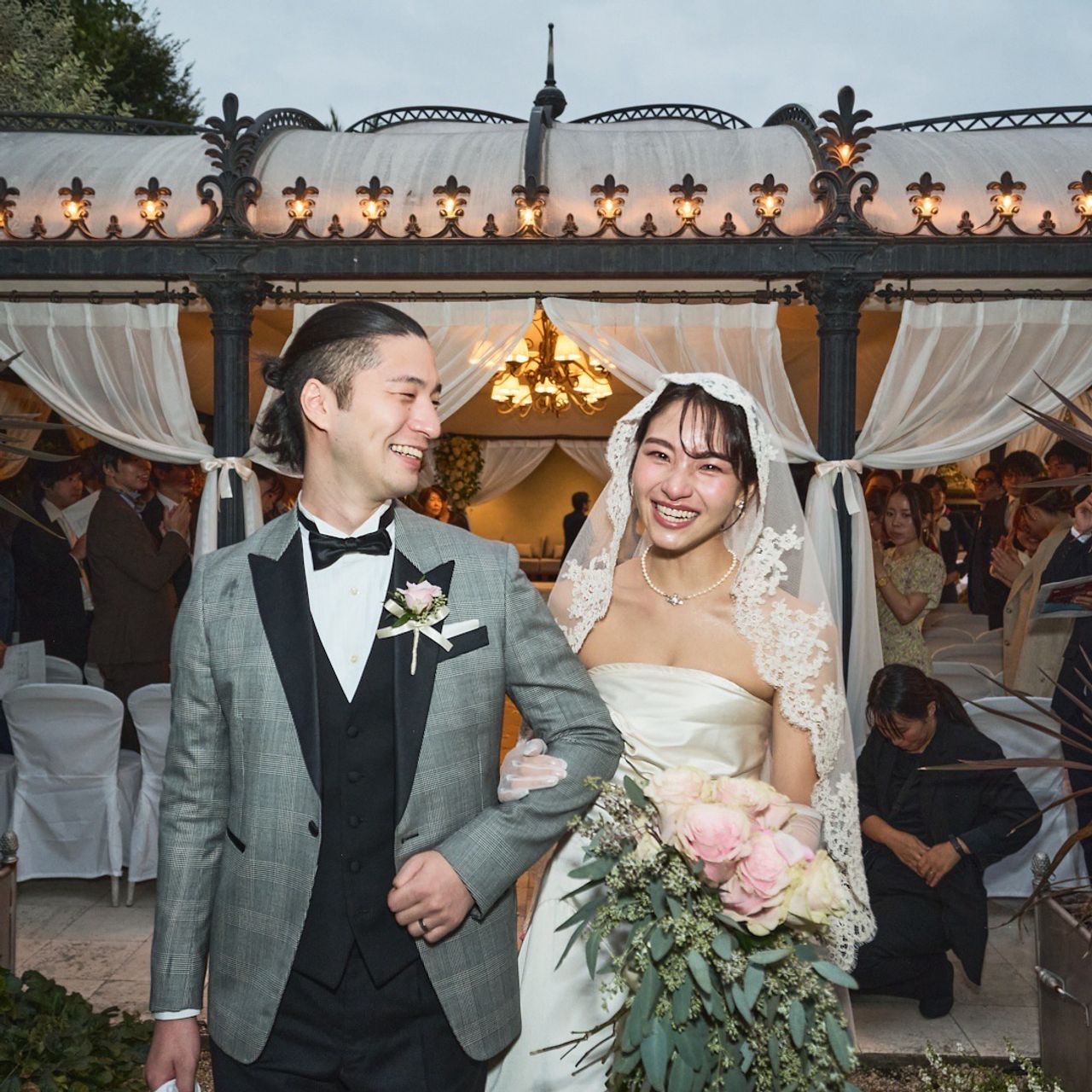 ガーデンの中のテントのようなガゼボで挙式を執り行いました。豊かな緑に囲まれた解放感とナイトウェディングならではのロマンチックな雰囲気が素敵です。