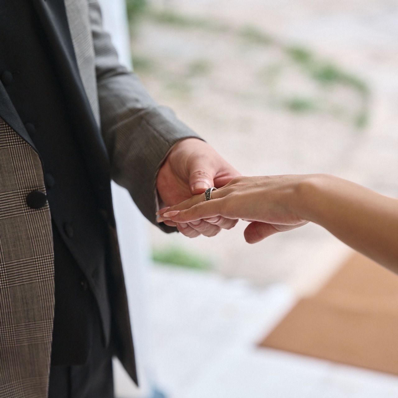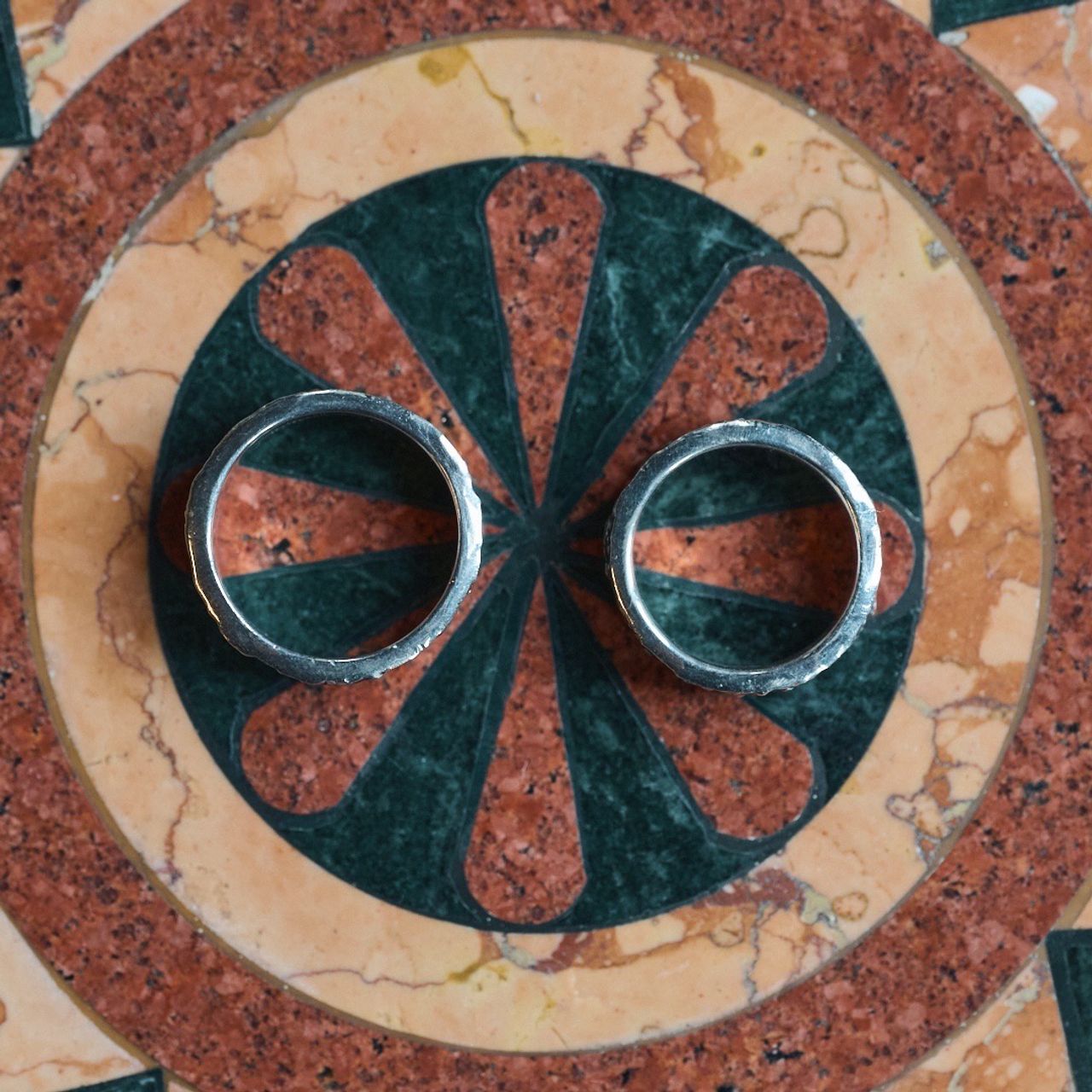 私が普段はごつめのシルバーリングが好きなので、いわゆる結婚指輪っぽさはないですが、おそろいのエイジングを楽しめるようなデザインにしています。