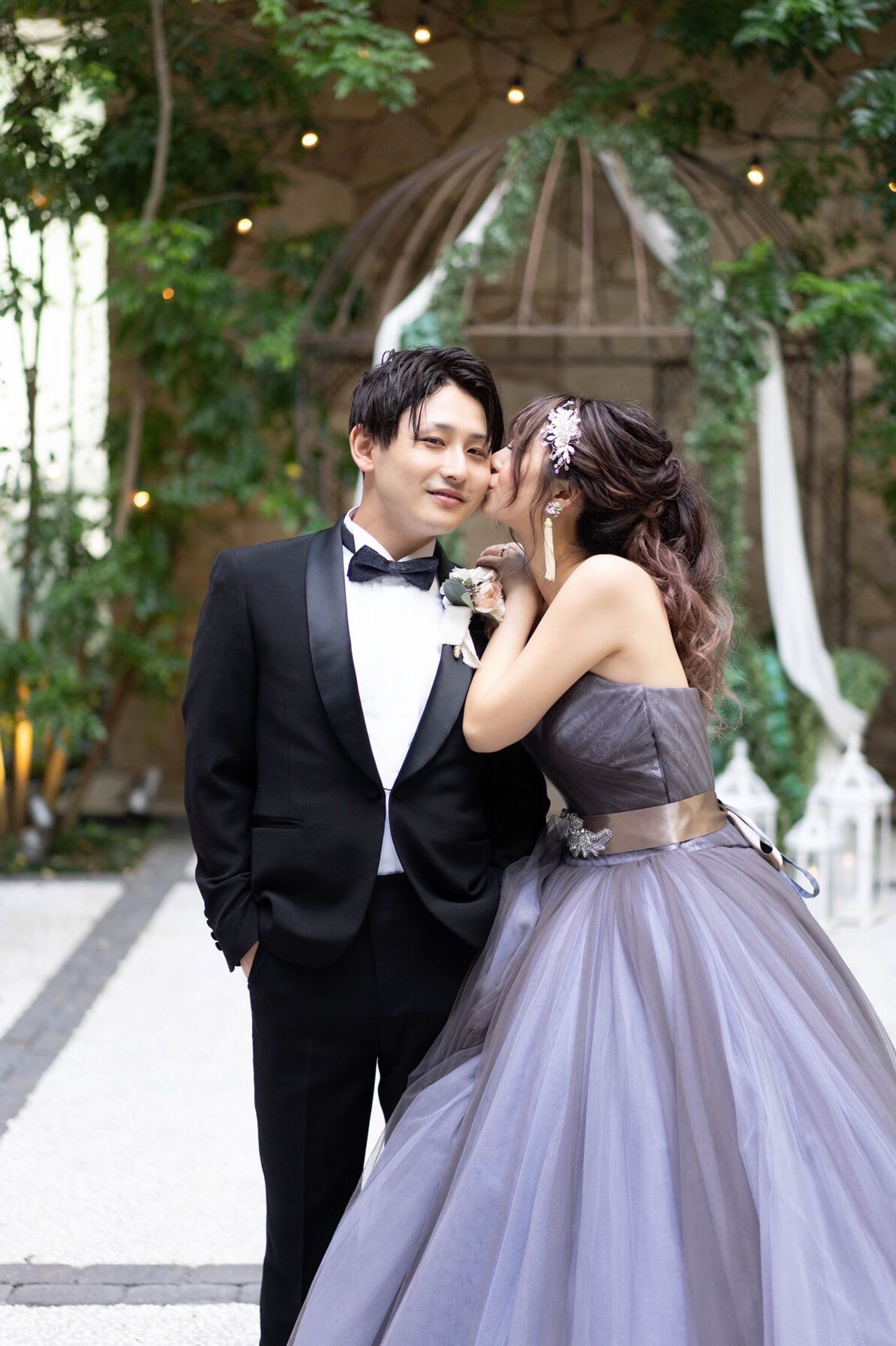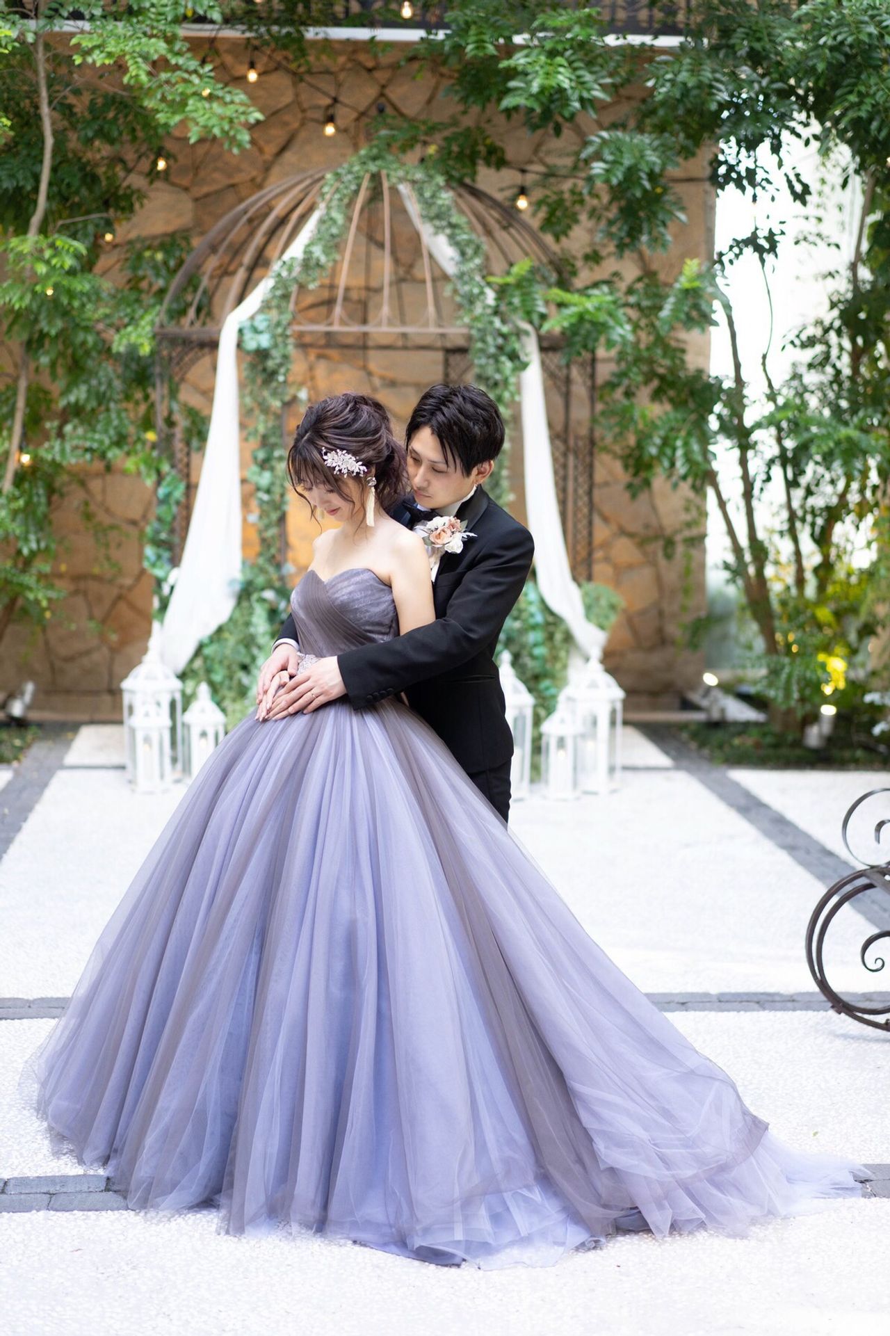マーメイドからの変化をつけたくてプリンセスラインにしました。光の当たり具合によって色が変わるパープルグレー。可愛さの中にも大人っぽい色味がお気に入りです。