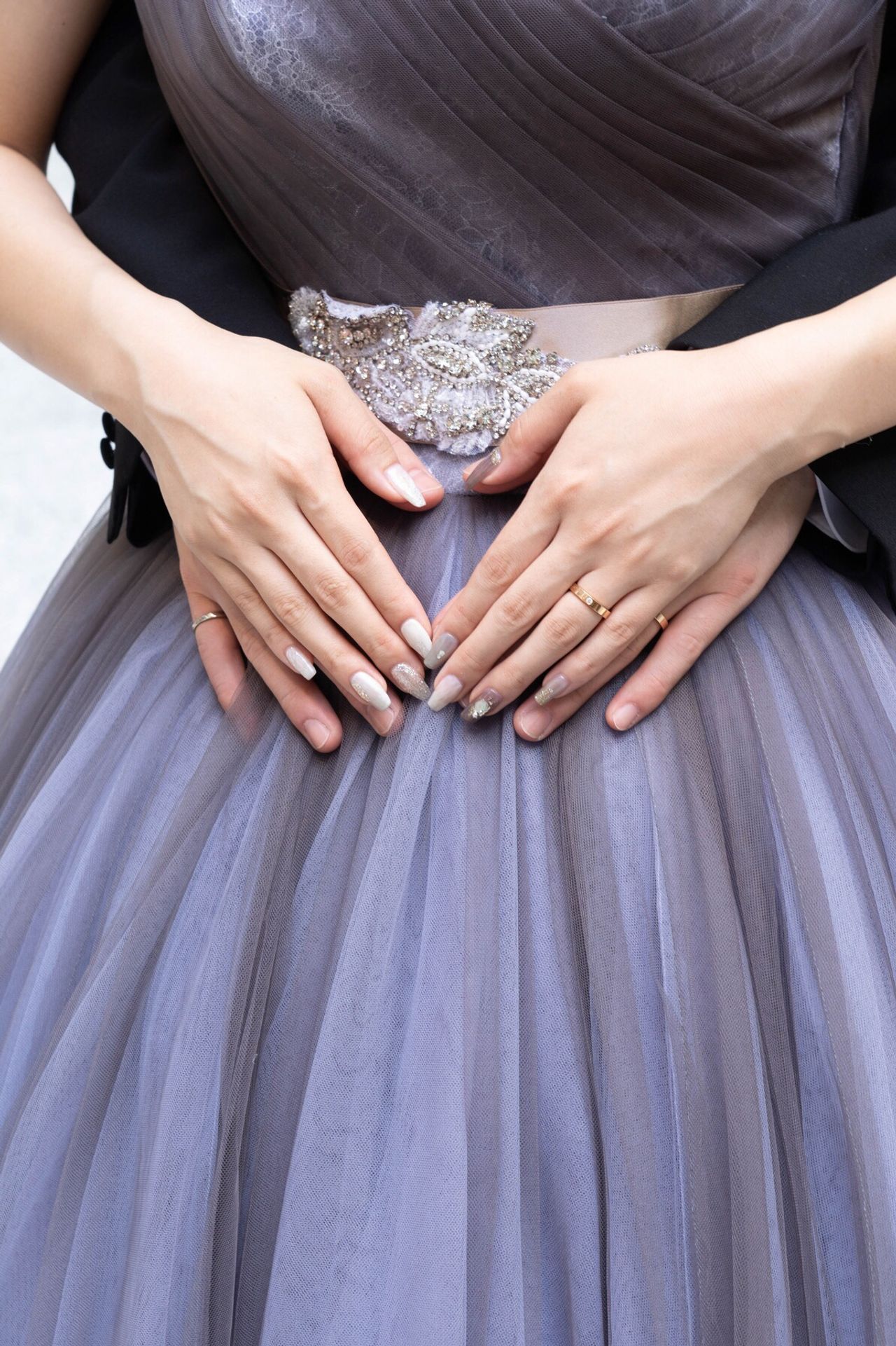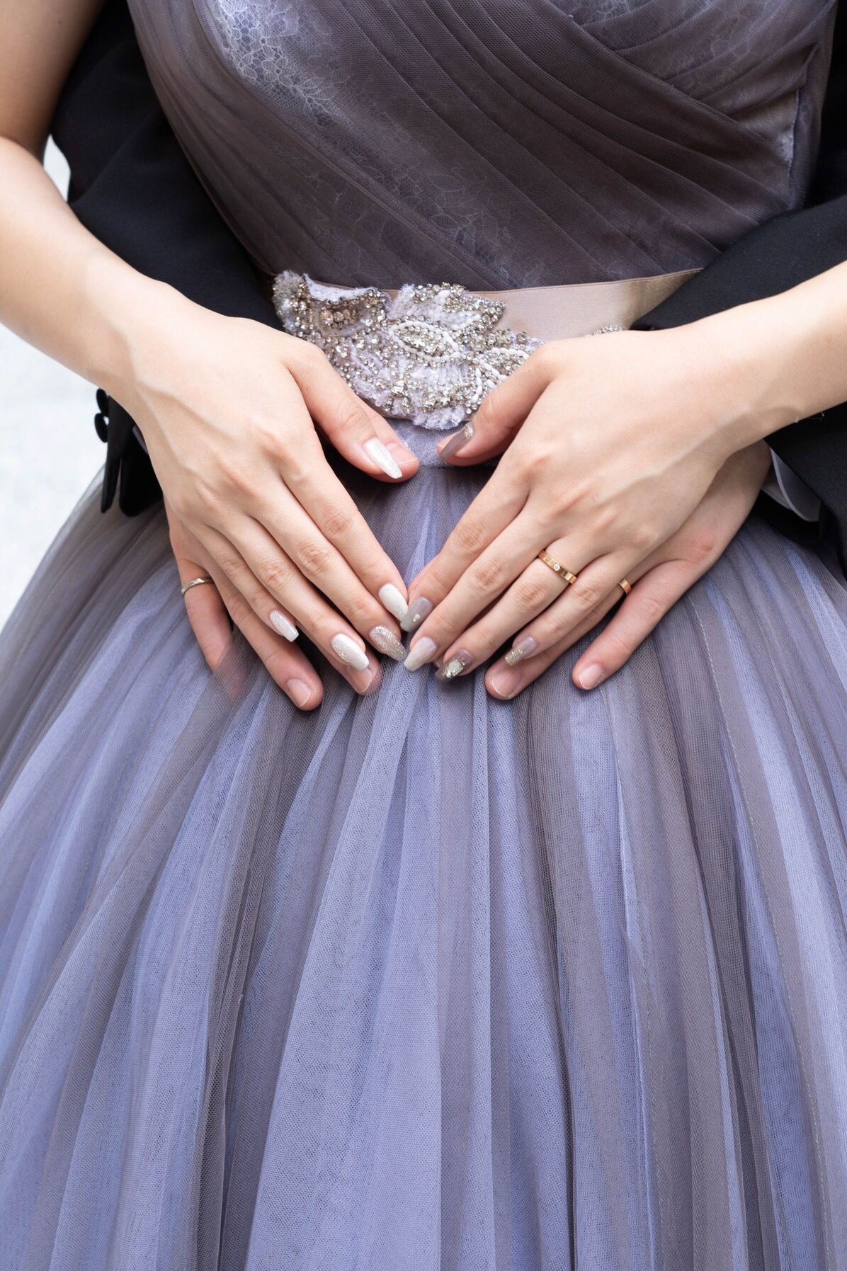 片方はウェディングドレスイメージのホワイトニュアンスネイル。もう片方はカラードレスイメージのパープルグレーのニュアンスネイルにしました。