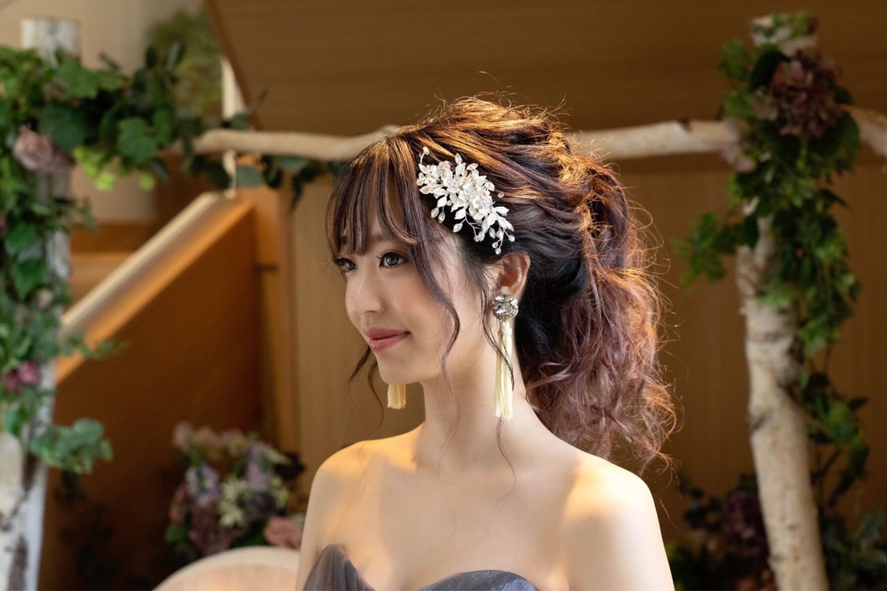 ヘアカラーはカラードレスに合わせてラベンダーベージュにしました。挙式では前髪を流して大人っぽく、披露宴では前髪を下ろして可愛らしくしました。
