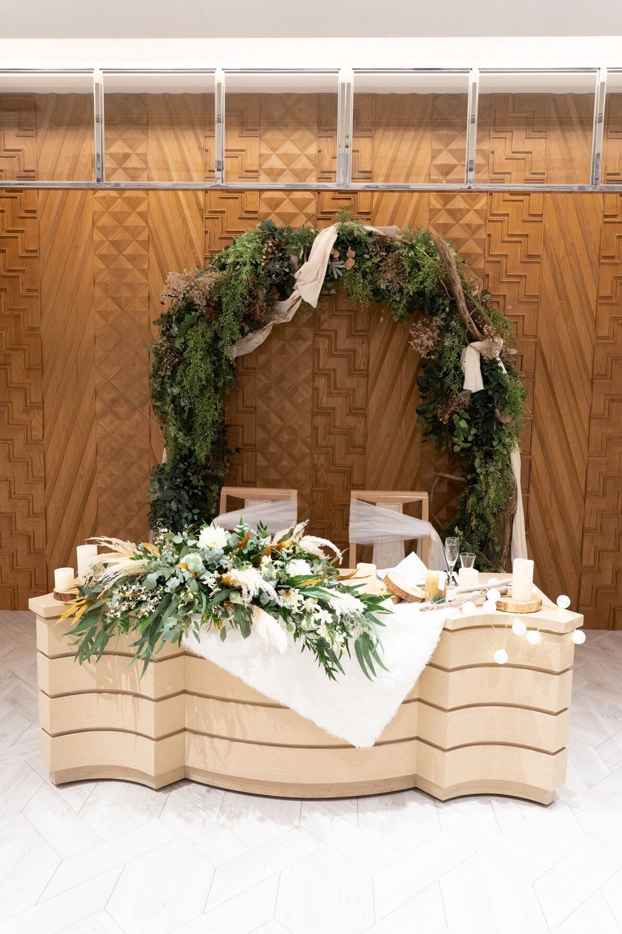 グリーンホワイトを基調にしてリゾート感あるお花とパンパスグラスを使って夏秋テイストにしました。