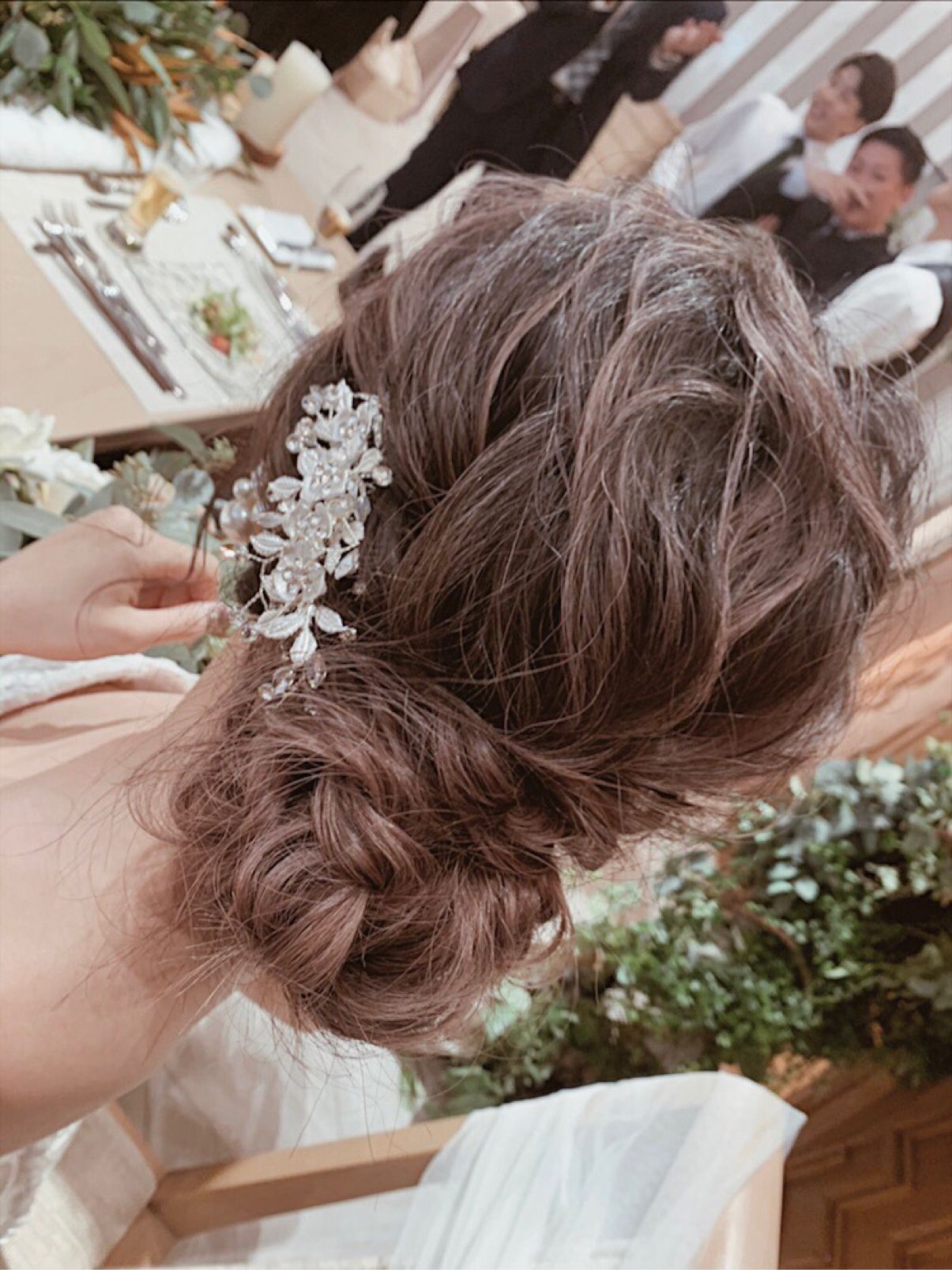 挙式では後ろに、披露宴中のウェディングドレスにはバックサイドに、カラードレスではトップサイドにつけて同じアクセサリーでも位置を変化させました。