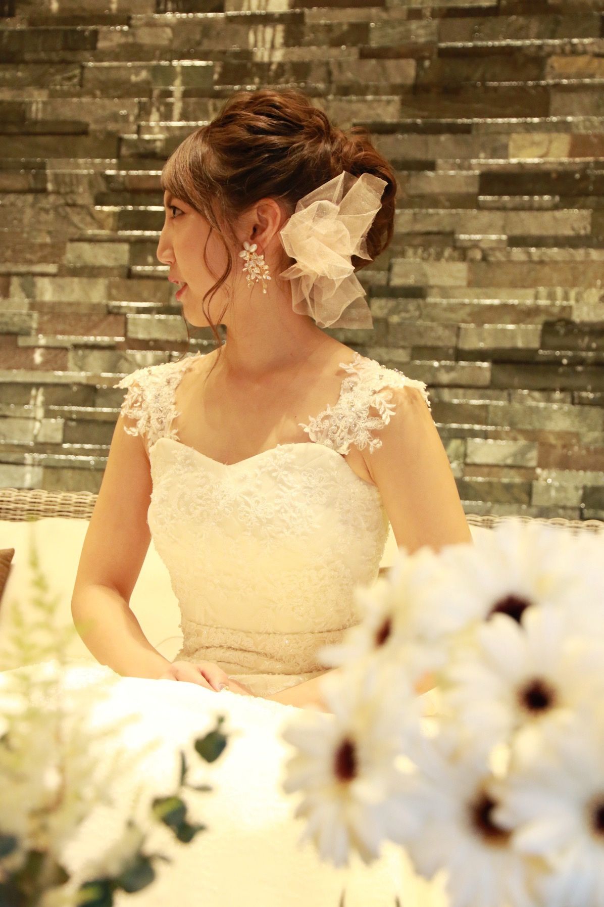 また、身長が低いのですが、ハイウエストの切替えのおかげでスタイルアップもできました。肩のレースは取り外しができ、挙式はベアトップで、披露宴は肩をつけました。