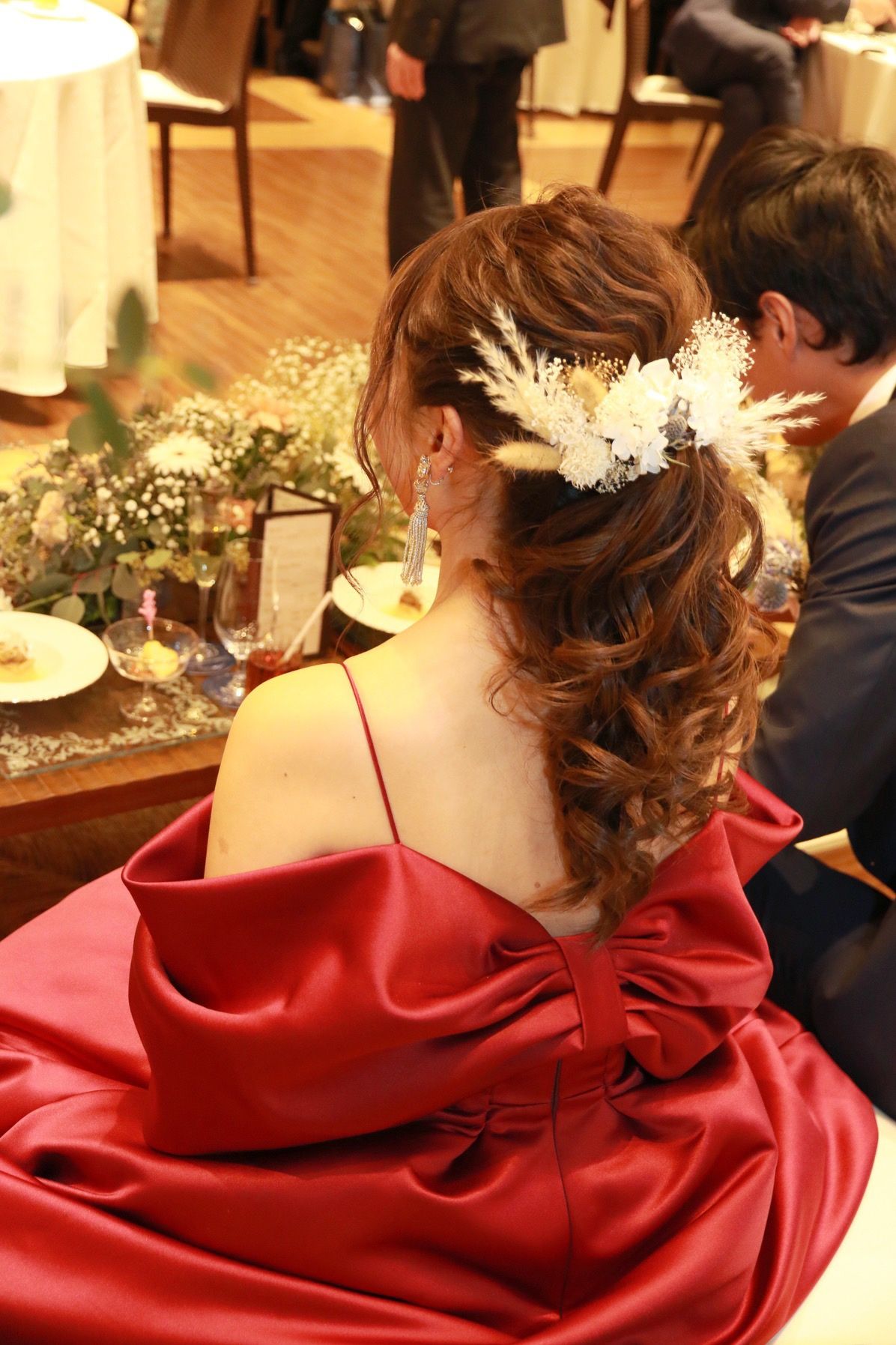 披露宴は淡いピンクのチュールの飾りをつくって頂き、付けました。カラードレスはブーケとお揃いで、ドライフラワーの髪飾りを作っていただきました。