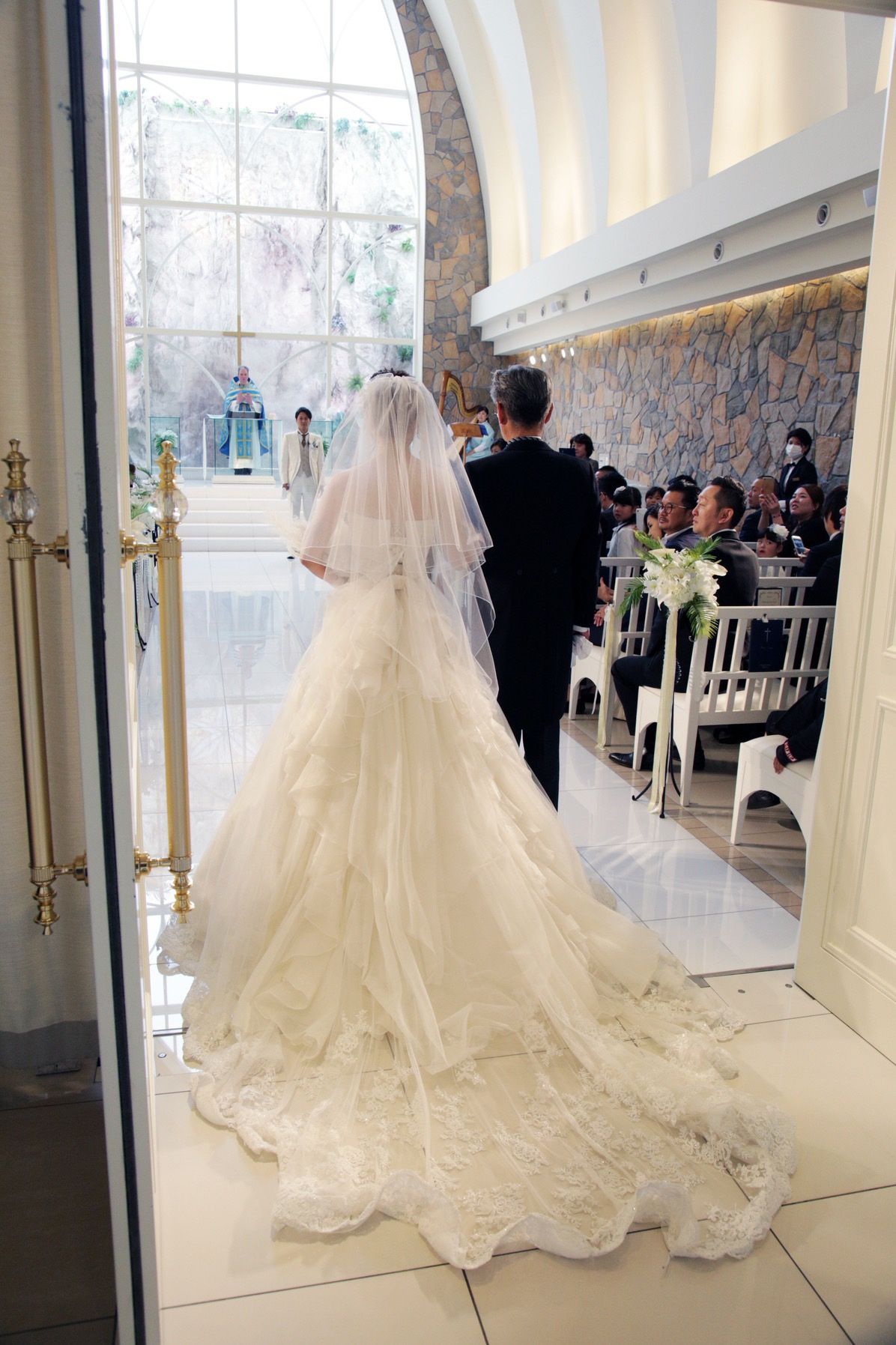挙式会場は天井が高く、開放感がある場所にしたいと思っていたので、NIHOの挙式会場はイメージがぴったりでした。真っ白な挙式会場でフェザーが落ちてくるシーンはとても幻想的で、ゲストもたくさん写真に収めてくれました。