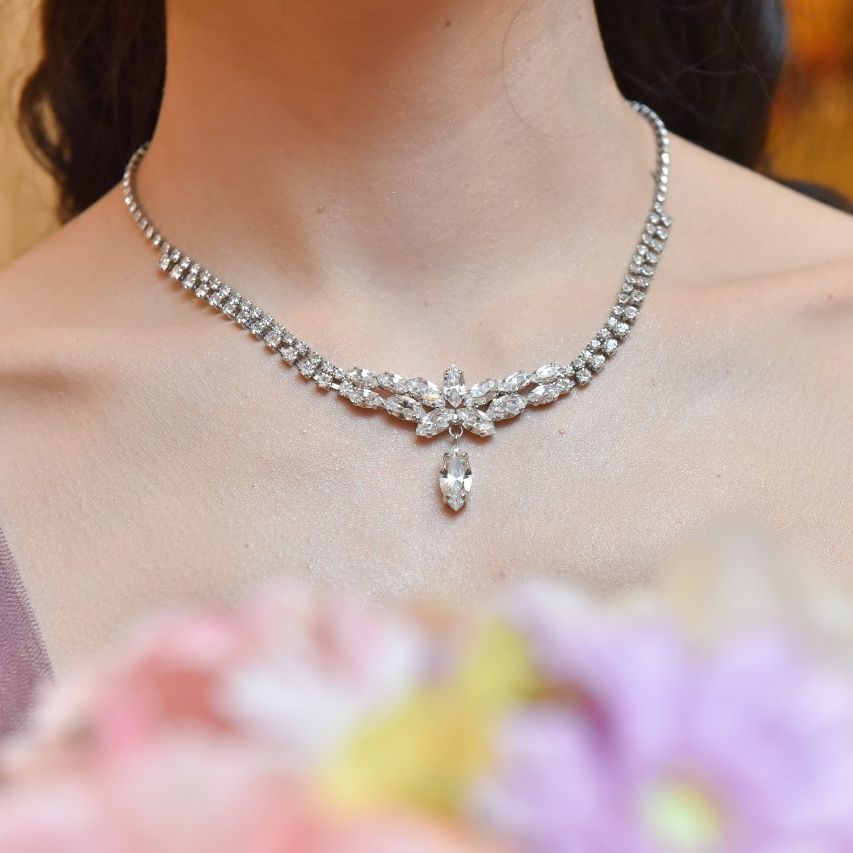 ネックレスにこれといってこだわりはありませんでしたが、ドレスに合うものということで小物合わせで色々合わせた中でこれっ!と思うものを無料のものをレンタルしました。
