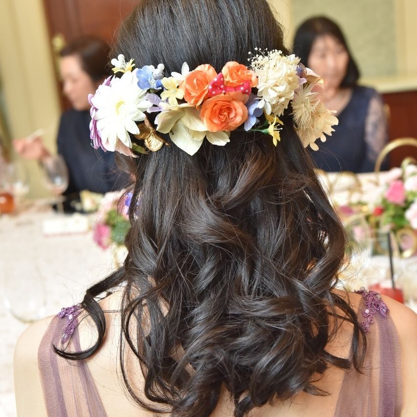 ラプンチェルが大好きな私はドレスや小物などの色、雰囲気をラプンツェルに近いものを選びました。ドレスはアンバサダーホテルではラプンツェルモチーフのドレスがありますが、ミラコスタではないため、ミラコスタオリジナルの紫のドレスにし、ヘアパーツとブーケはインスタで見つけた方にお願いしました。ヘアパーツにもブーケにもラプンツェルといえばガーベラなのでピンク、紫などを入れていただきました。それに合わせてピアスも紫の花にしました。装花もブーケやヘアパーツに合うようにピンク、紫が入ったものを選びました。