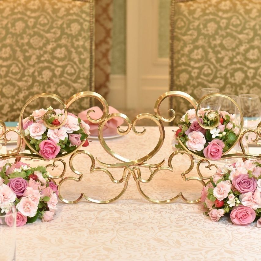 お花は自分達で決めることができなくて(ディズニーとの契約の関係のようです)、色味のみ選択しました。新郎新婦のメインのところはミラコスタマークのものか、ミッキーミニーの装飾か選べるのですが、ここは少し課金しても写真に残る可愛いものがいい!とミッキー、ミニーのものにしました。色味はピンク、紫の花が入った方がブーケやラプンツェルっぽさが出ると思いこちらにしました。