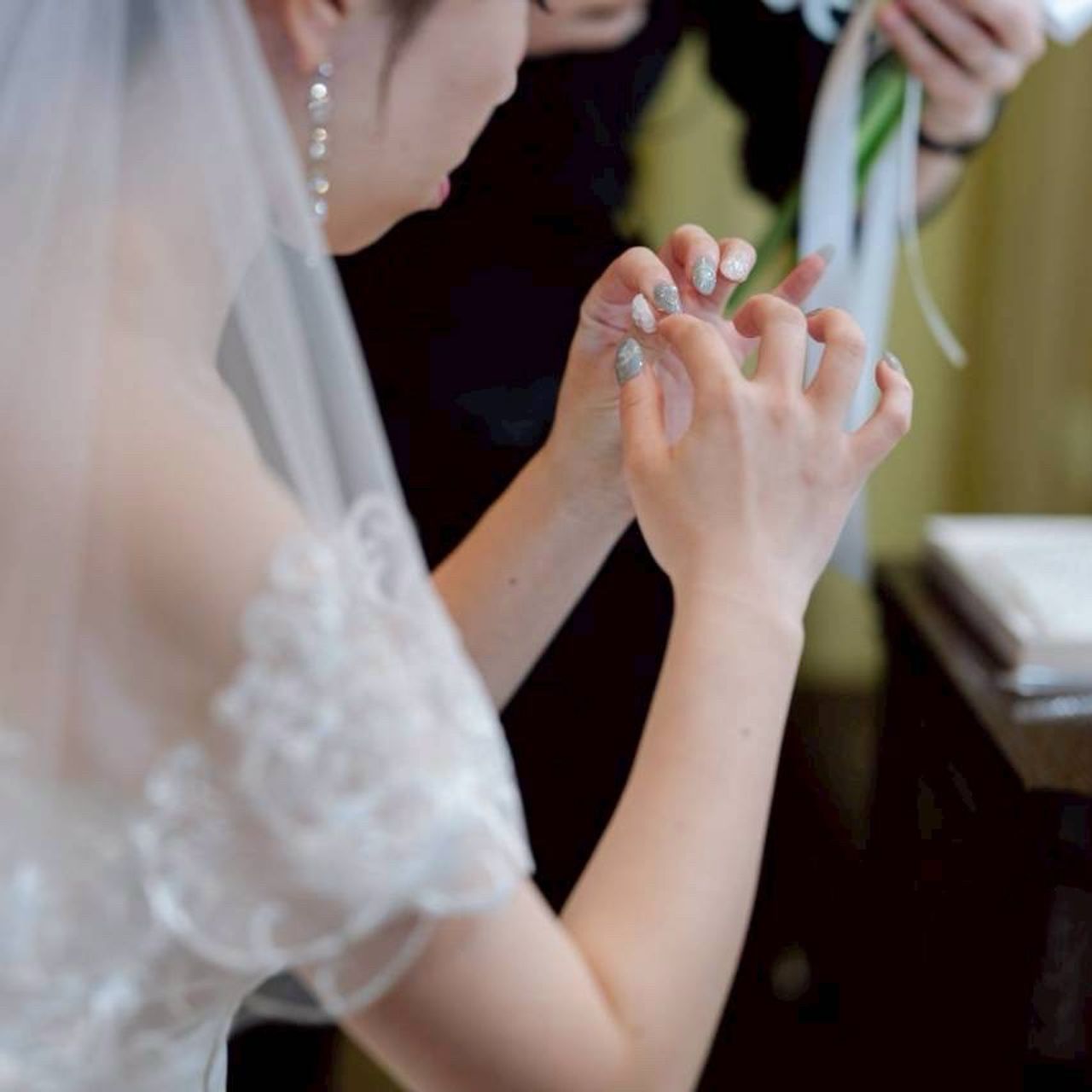 披露宴中に1枚紛失し、 お色直し中もとれてしまったので、再入場ではいつもの自分らしくネイルチップを外しました(笑)