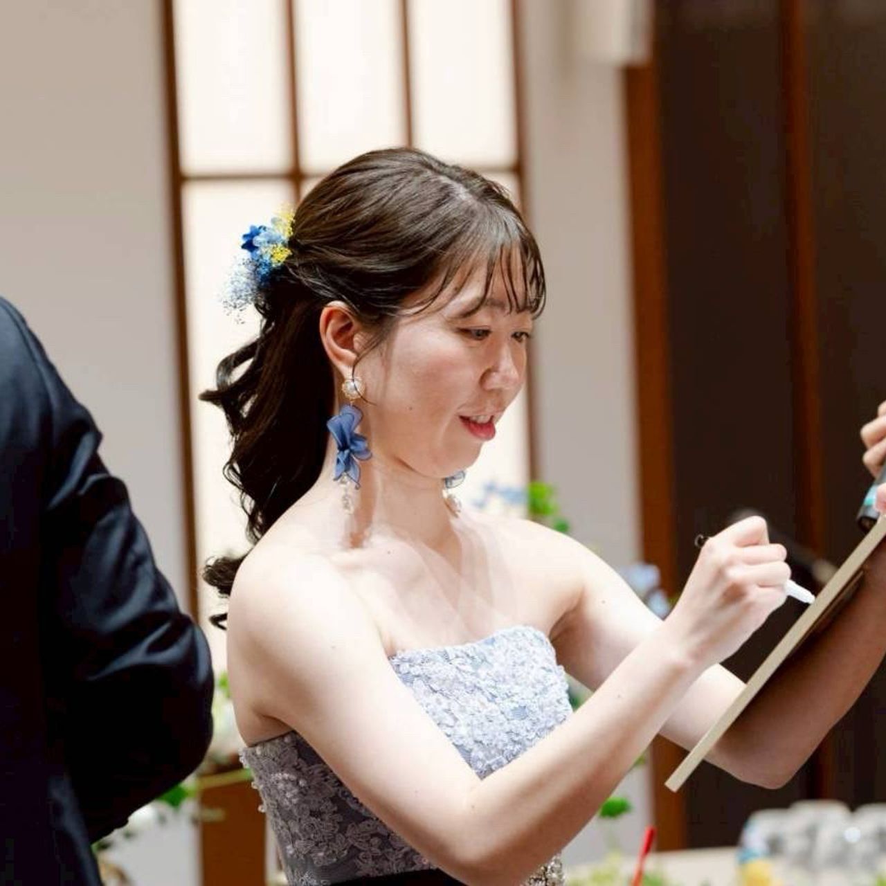 ウェディングドレスのときはシルバーの揺れるピアスを、カラードレスのときはネイビーのお花とパールの大ぶりピアスをつけました。