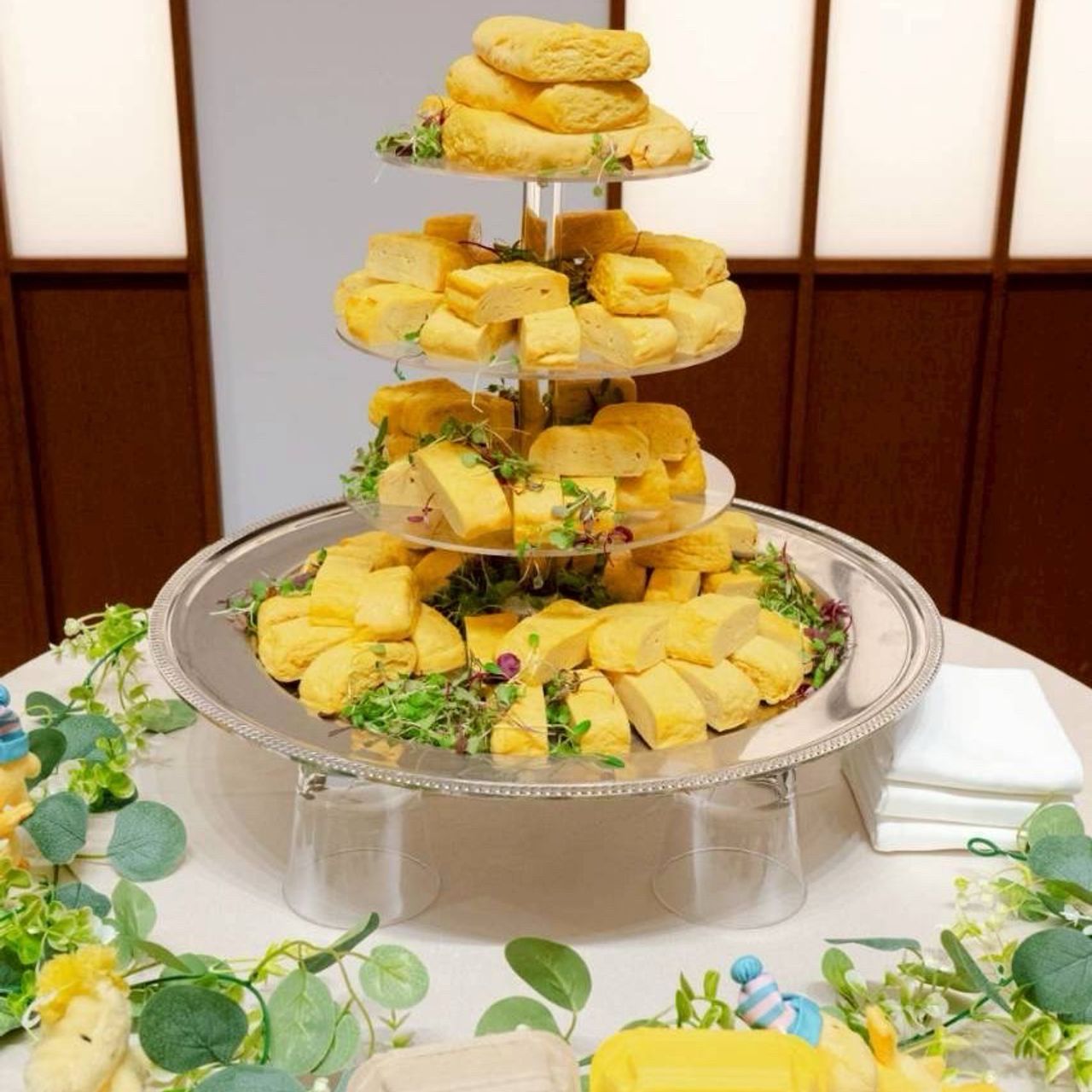 ウェディングケーキに代わる演出として、だし巻き玉子をたくさん重ねた、だし巻き玉子タワーを作っていただきました。