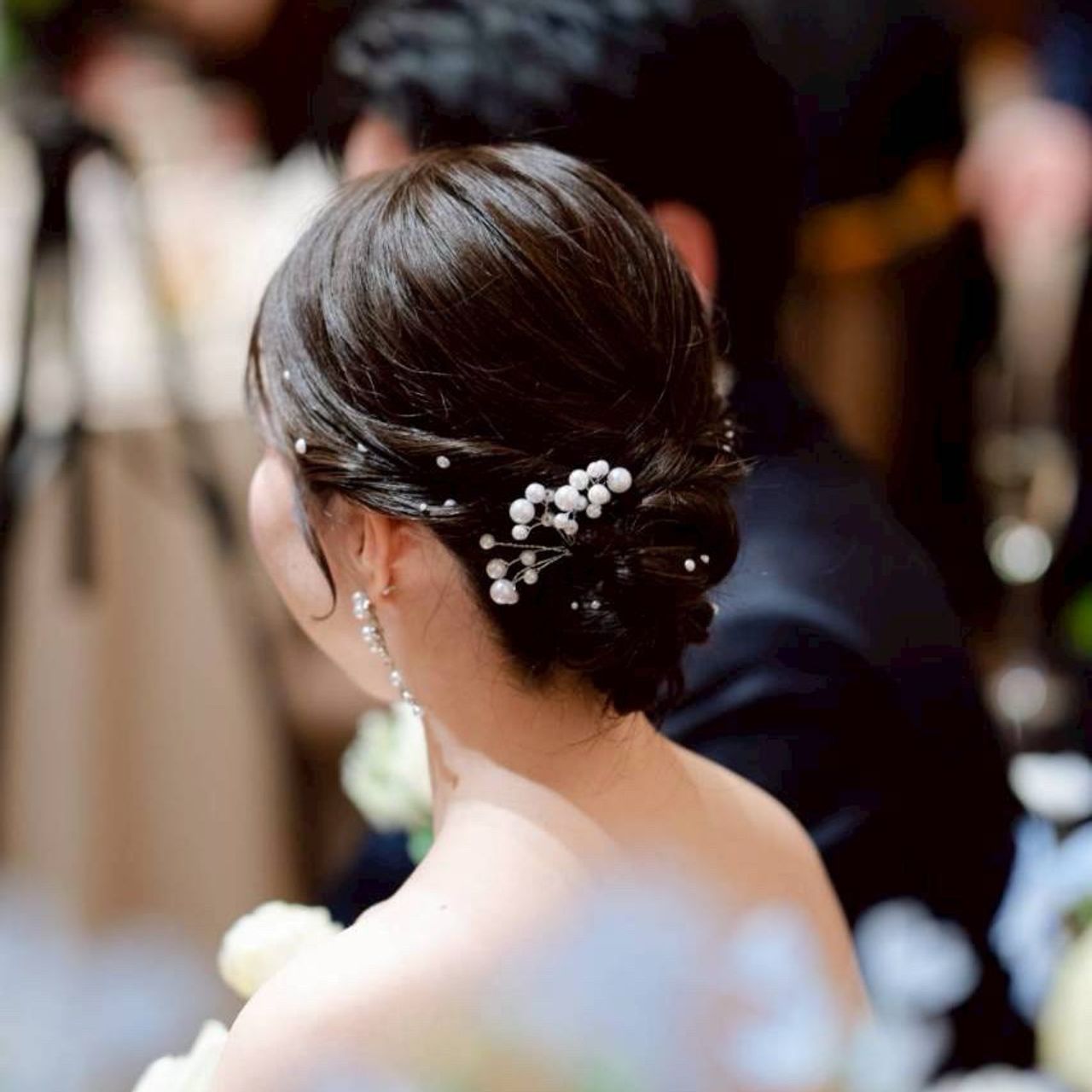 挙式では小さめのティアラ、披露宴ではパールピンとパールシールにしました。