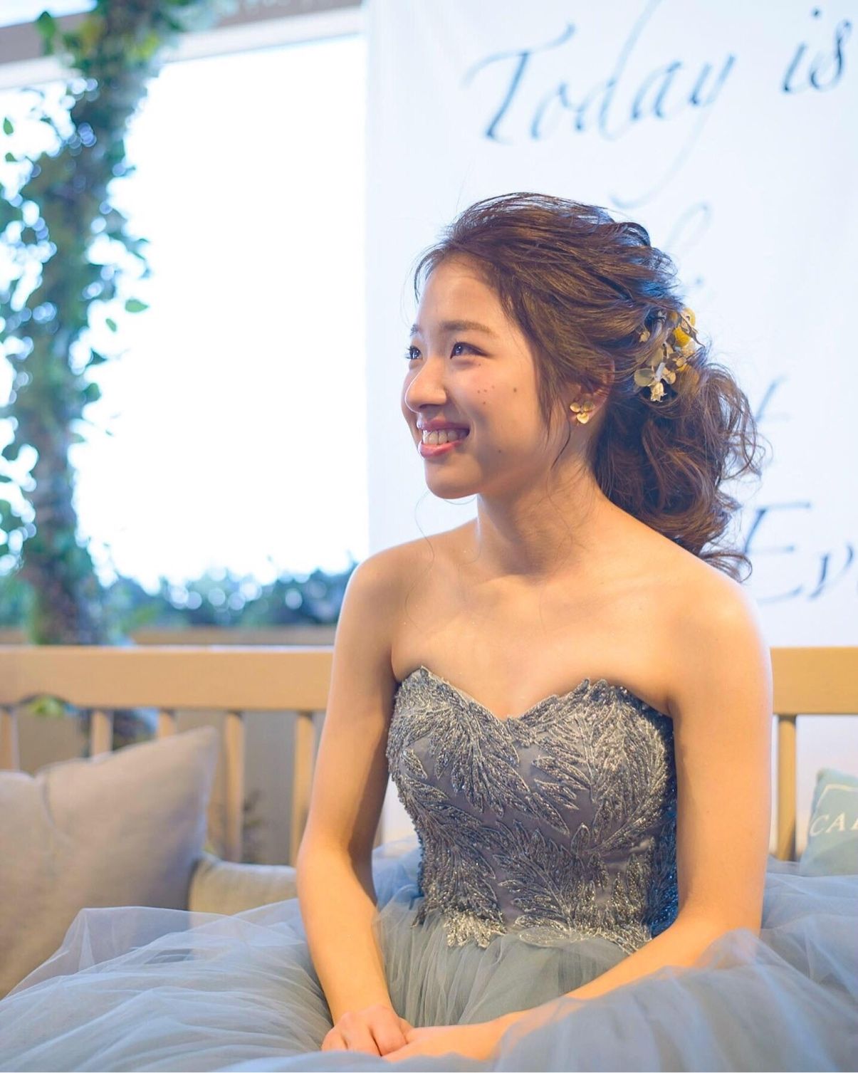 カラードレスは、高めポニーで前髪もアップして大人っぽく。ウェディングドレスはふわふわにして、低めの位置でお団子っぽくしました。