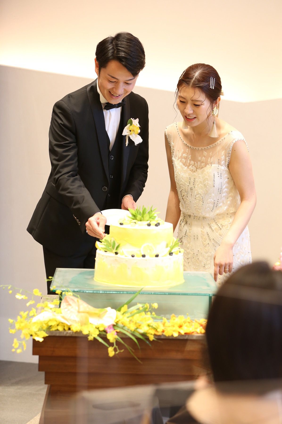 レモンイエロー色のケーキにレモンやマスカットが乗った、爽やかでシンプルなデザインにしました。ケーキのデザインは自分で考えてプランナーさんにお願いしました。