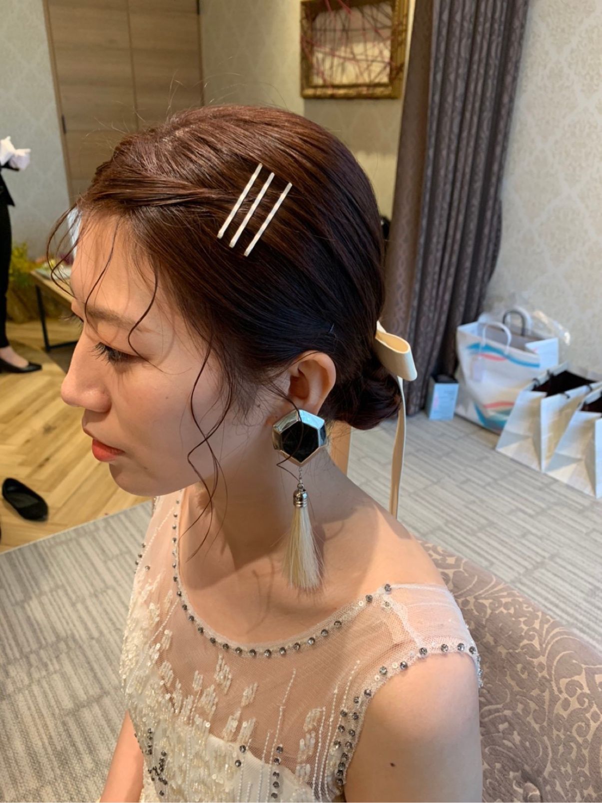 ヘアはなるべくタイトにシンプルに仕上げてもらいました。お色直しの時は玉ねぎヘアでちょっとガーリーにしてもらいました。