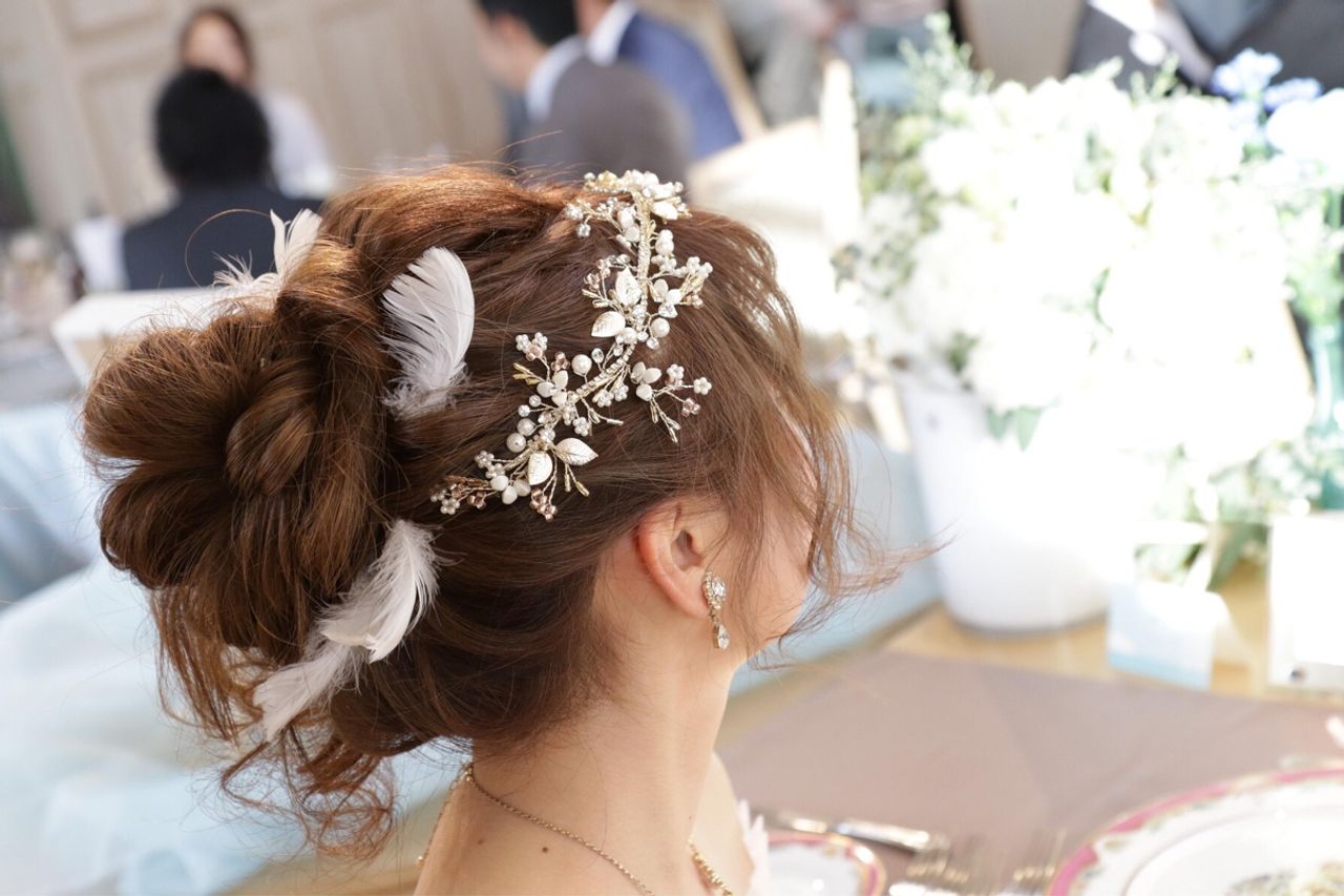 披露宴では小枝のカチューシャに、自分でDIYした羽のパーツを、お色直し後も自分でDIYしたマリンテイストのヘッドアクセサリーをつけました!