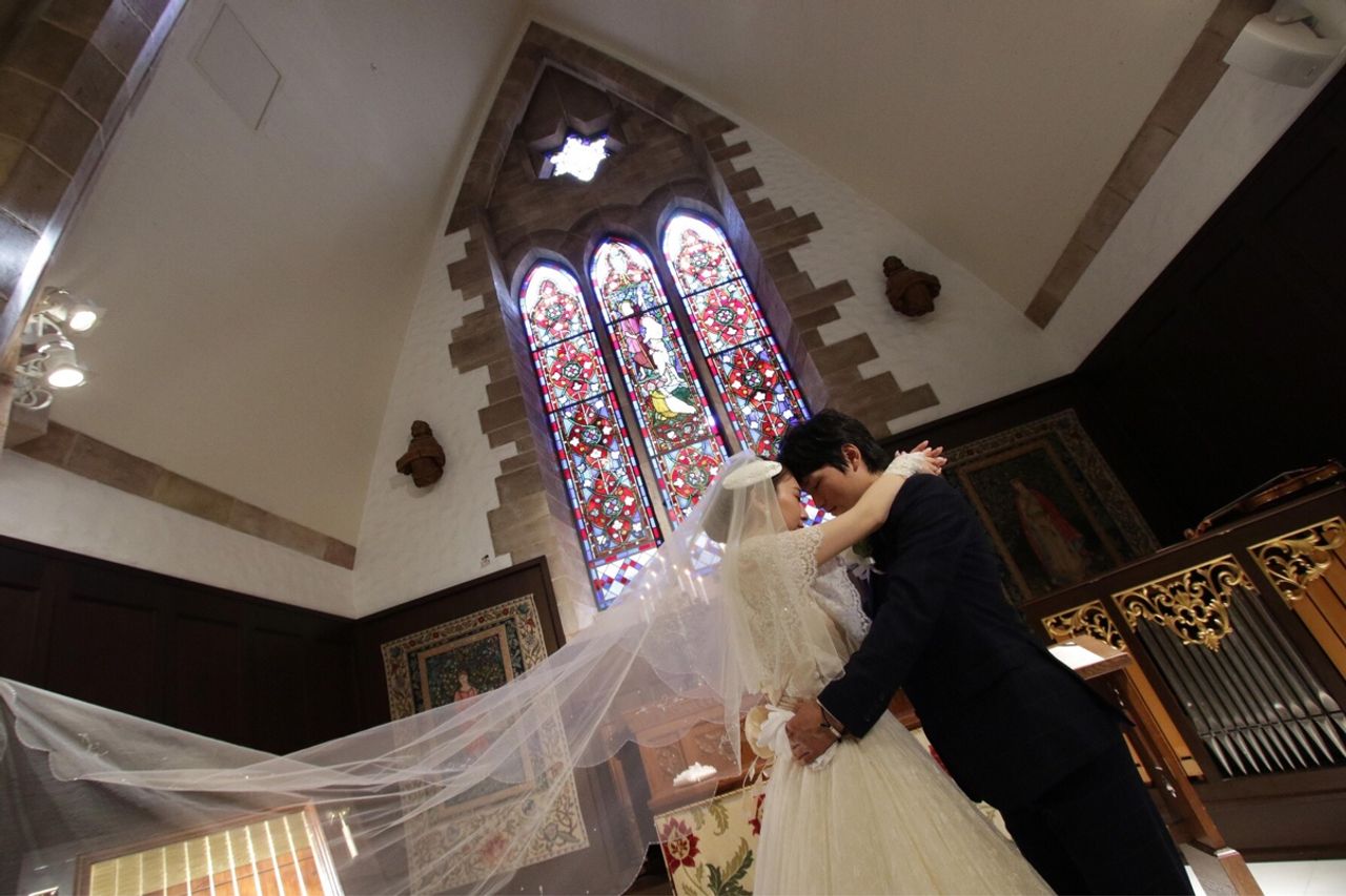 ホテルの中にチャペルがあるので、雨の日や暑い日、寒い日でも気になりません! チャペルはイギリスの田舎の教会みたいな感じでとてもクラシカルで素敵です。