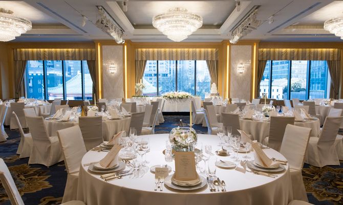 The Okura Tokyoを選んだ決め手は披露宴会場です。披露宴会場のメイプルは絨毯が青く、壁に壁画模様の絵があり、ホテルだからこその荘厳な雰囲気でした🎵