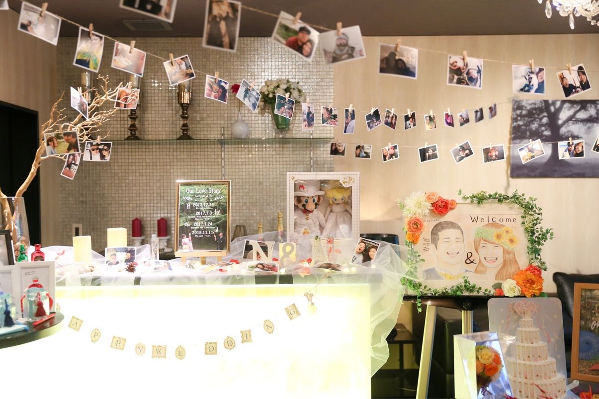 和装ガーランド、芳名帳、ラブストーリーボード、似顔絵、ドレス当てクイズデザイン、ウェルカムウコン、カロリミット、和装ウェルカムボード作成、当日のムービー、結婚式の動画編集、Blu-ray作成、プロフィールムービー作成、エンドロールムービー作成、プチギフトパッケージデザイン
