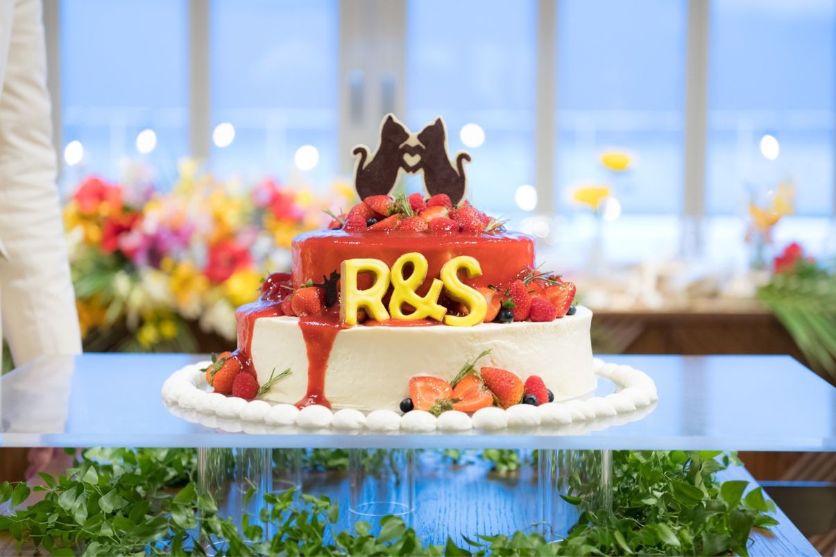生クリームが苦手だったので、クリームチーズケーキにして頂きました。ネコ型のクッキーがハートを作るようなデザインにしました。ベリーソースを二人でかけ、新郎新婦のイニシャル型のアイシングクッキーを装飾して完成としました。
