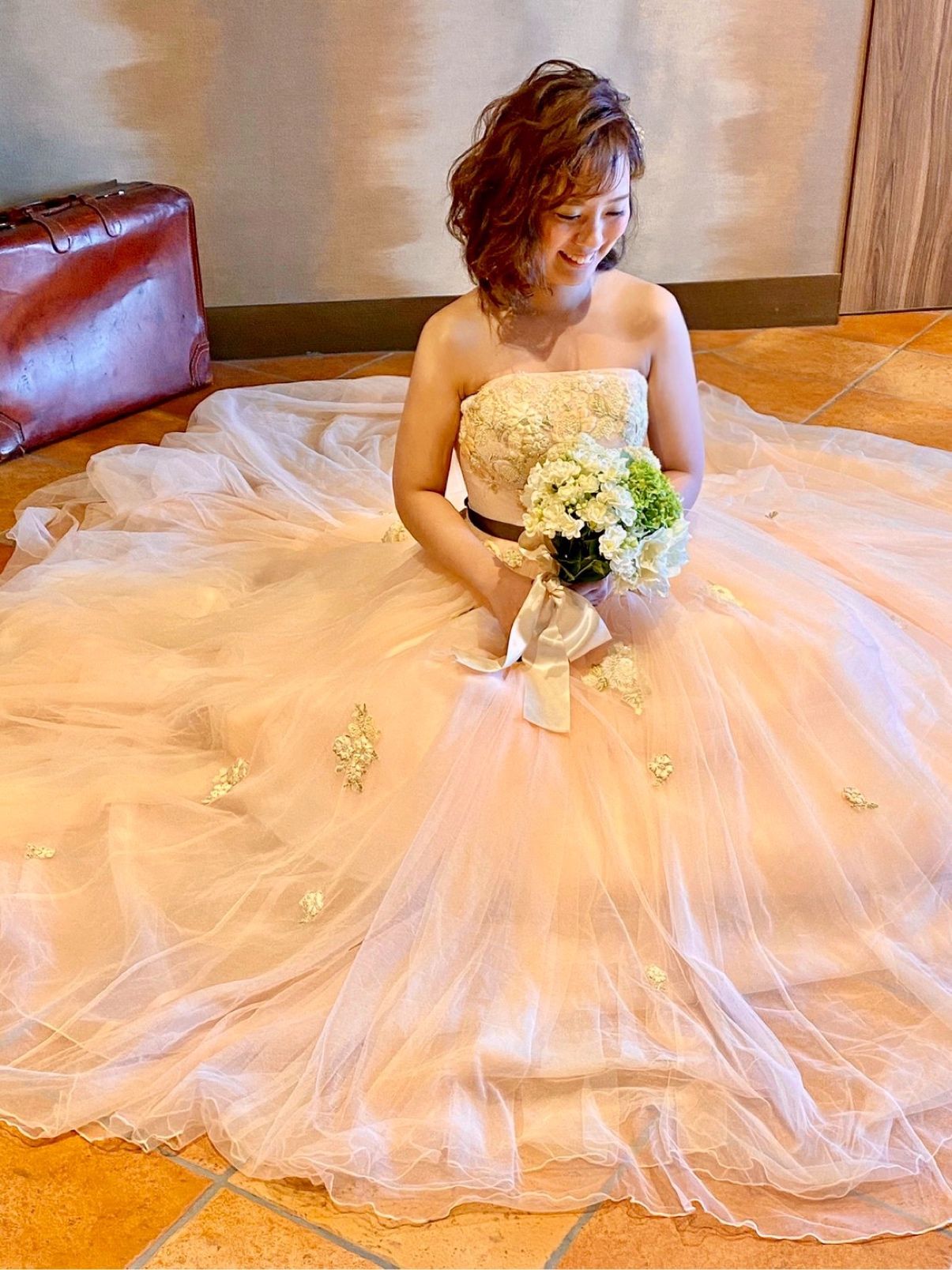 絶妙な色味のドレスなので、原色系やキラキラ系などの華やかなドレスが苦手な方、人とはちょっと異なるデザインのドレスを着たい花嫁さんにもおすすめです^^着用時に、新郎のタキシードと同色のリボンをウエストマークにして統一感を出しました。
