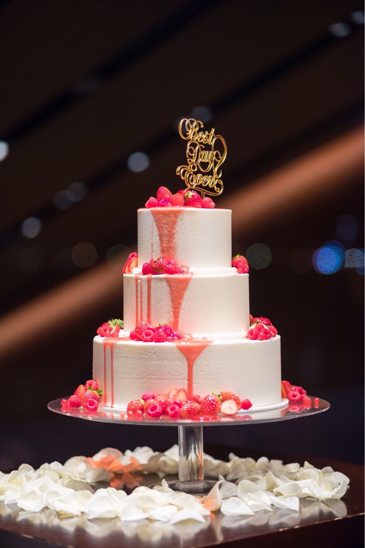 パールのようなポコポコした生クリームのデコレーションを取り入れて頂きたく手絞りでシェフにお願いをして作って頂きました!また、ケーキカットからのファーストバイトをしたくなかったのでカラードリップを取り入れ白のショートケーキに苺ソースをかけてケーキとソースの色のコントラストを出しました!