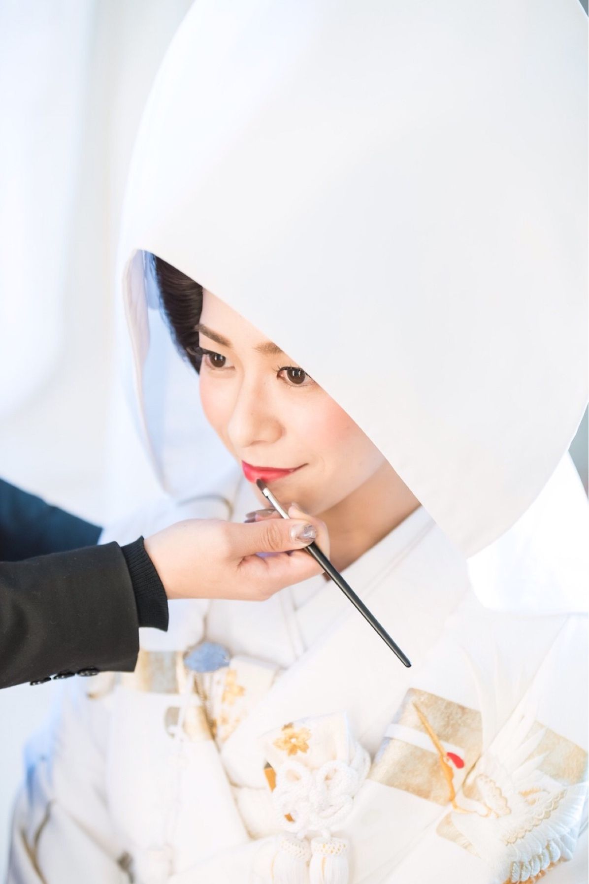 白無垢は文金高島田と綿帽子。色打掛は 胡蝶蘭をつけてまとめ髪にして花を大きく使い顔を小さく見えるようにしました。ドレスでは幼少期からの憧れのやまとなでしこスタイルでリボンボンネを選びました。