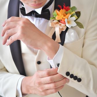 海が好きなので、一番こだわったのは、全体的な装飾にプルメリアの花や貝殻、砂、流木を使用しました。また、Blue×White×Brown×Greenのみの色遣いに統一しました。