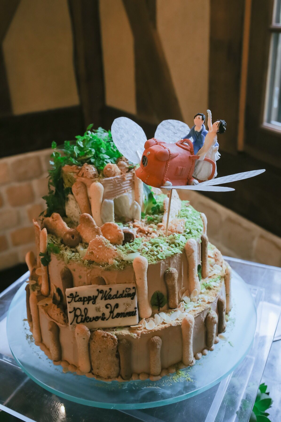 ウェディングケーキはラピュタの城です!とても可愛く再現していただきました。また、新郎新婦の人形がフラプターという、ラピュタに出てくる乗り物にのってるのもこだわりです👌