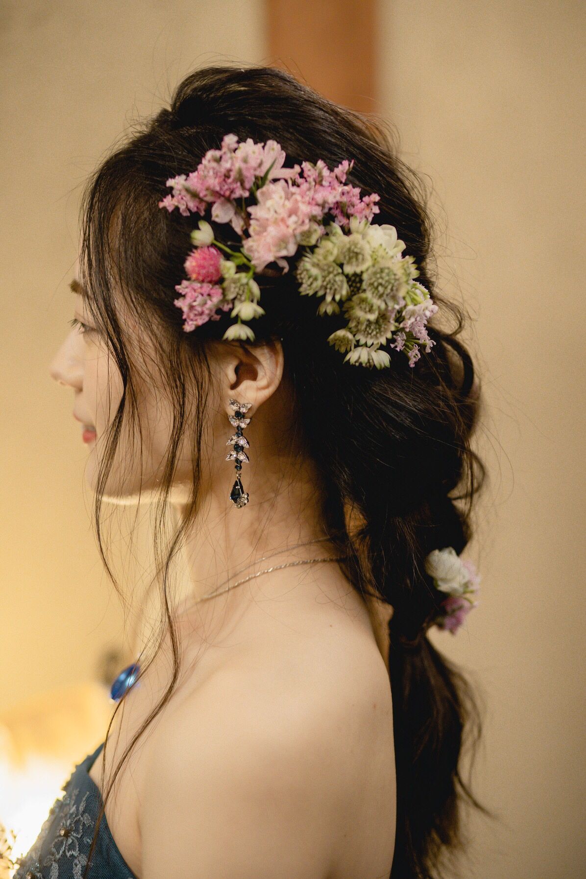お色直しでは、カラードレスを天空の城ラピュタのシータをイメージしていたので、後ろで三つ編みにして、ピンクのお花で女の子らしい可愛らしさを出しました🌸