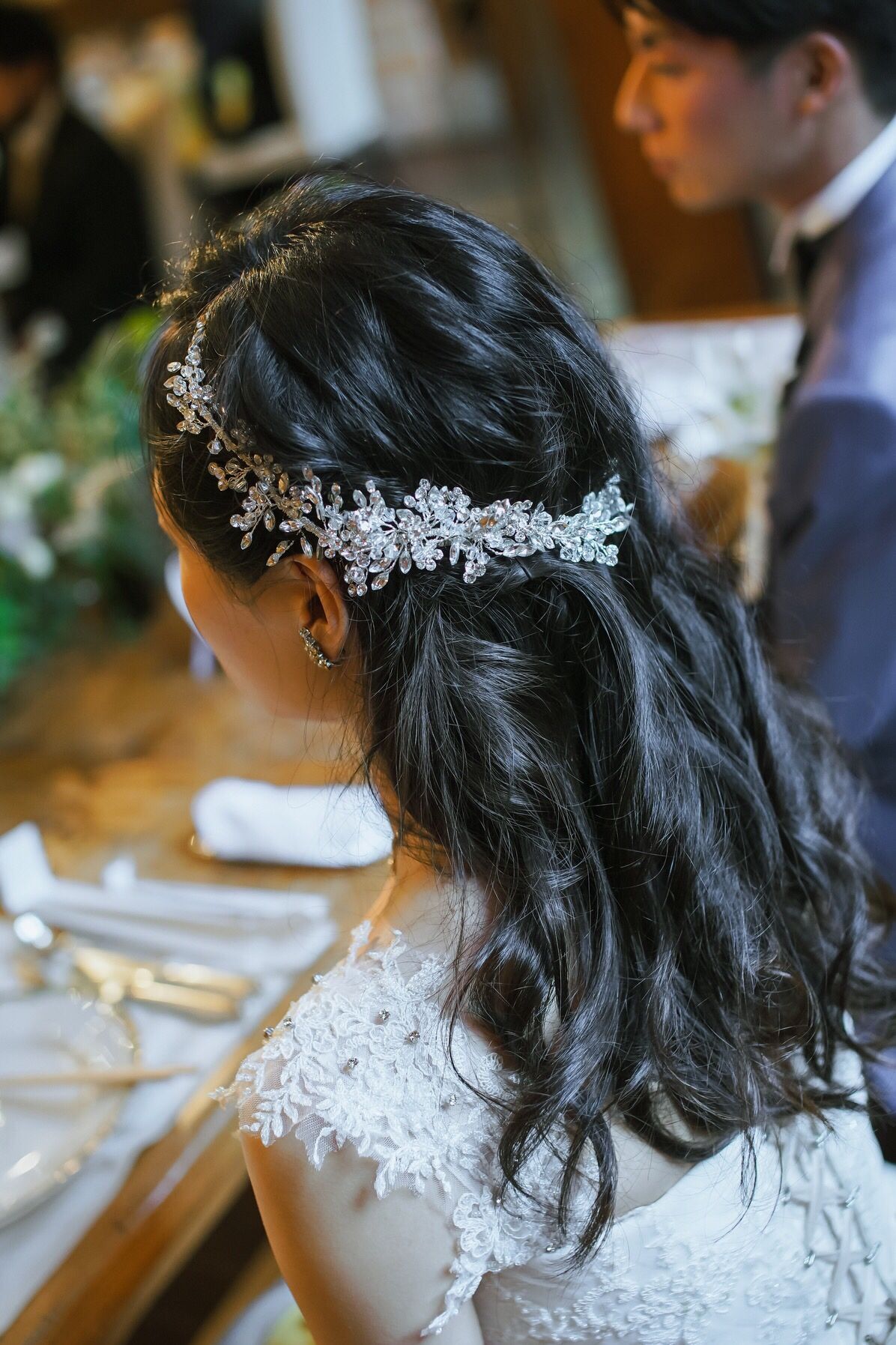 再入場では、華やかなシルバーのイヤリングとネックレスにチェンジ!