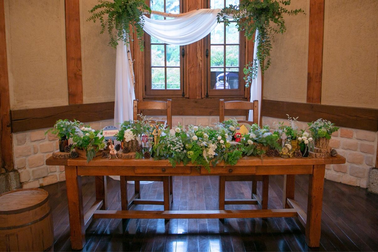 式場と披露宴会場が一緒になっている一つの貸切邸宅なので、時間に追われることなく、ゲストと充実した時間を過ごすことができます🙌式場と同じく木をメインにした会場なので、葉っぱをたっぷり使う装花が良く映えて、ナチュラルでおしゃれな空間です🕊