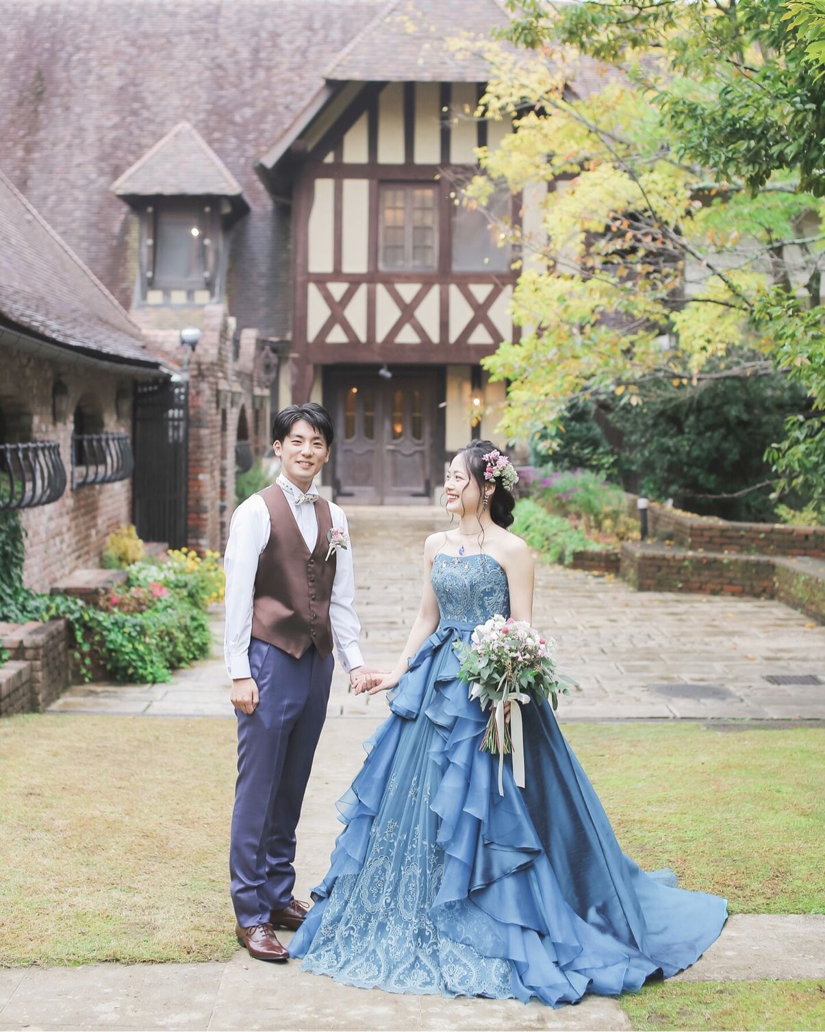 このブルーの色味がとにかくお気に入りでした。くっきりした鮮やかな色味ではあるものの、深みがあってアンティークな雰囲気の式場にぴったりでした。また胸元のビジューの刺繍が美しく、婚約記念品として送ってもらった飛行石のペンダントでシンプルな首元にしたかったので胸元が華やかなのがとてもしっくりきました!