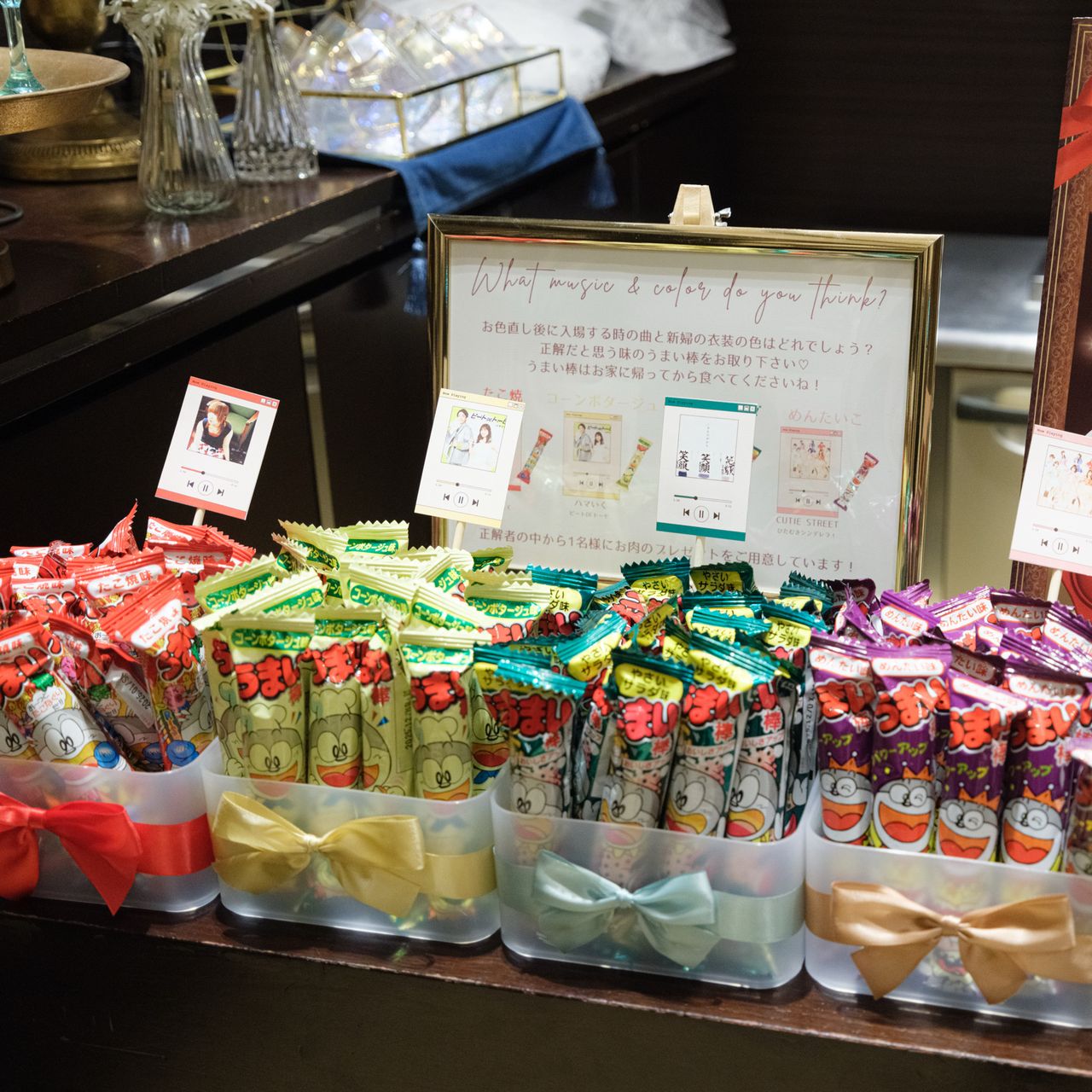 親族と恩師以外のゲストには、お色直し中の待ち時間に退屈しないよう“自分たちで好きな引き出物&引き菓子を選ぶギフトマルシェ”を用意しました。