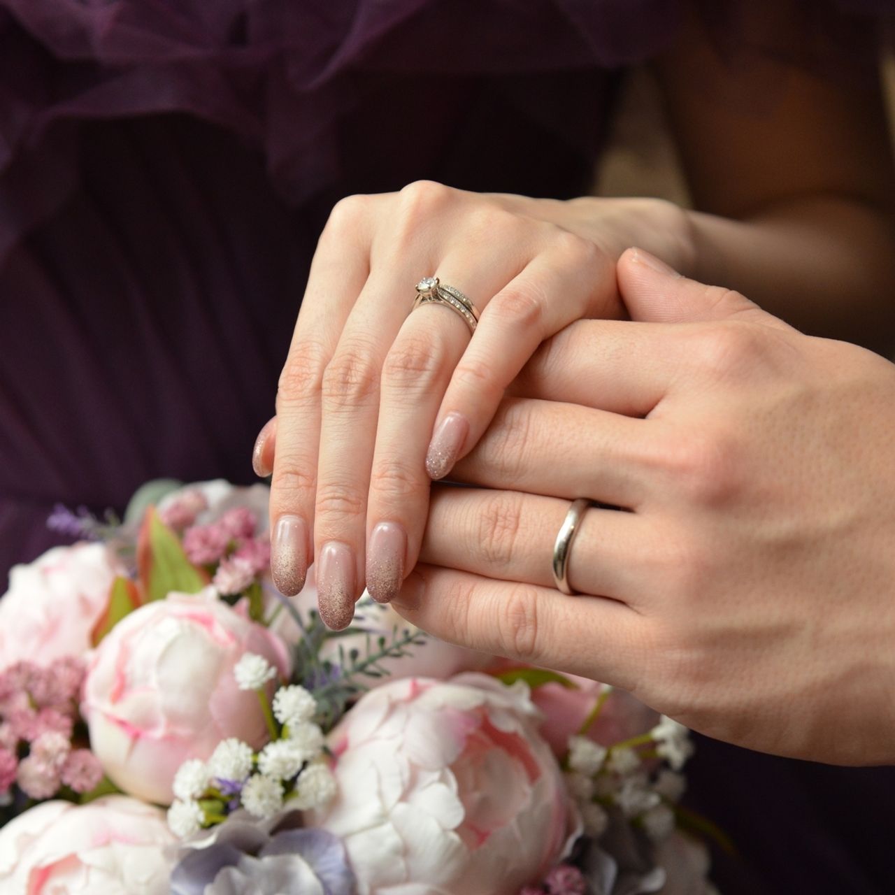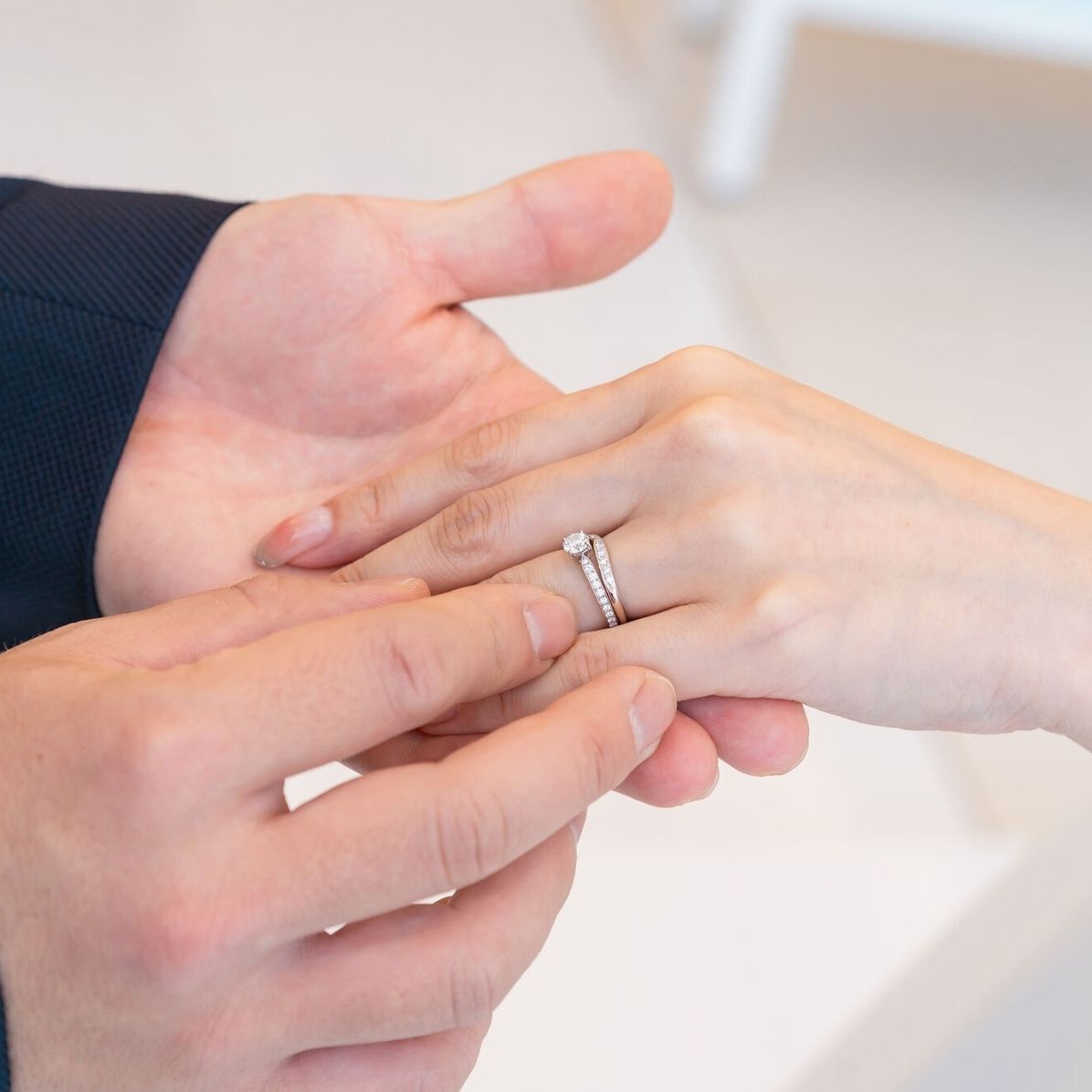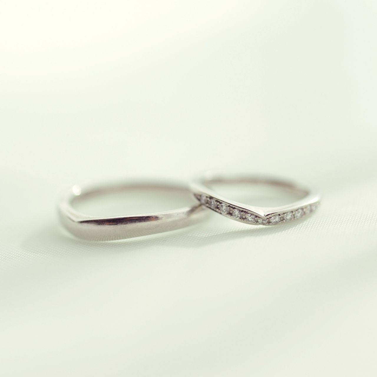 ハーフエタニティのVラインの形がとても綺麗で、婚約指輪がぴったり重なるのがお気に入りです。