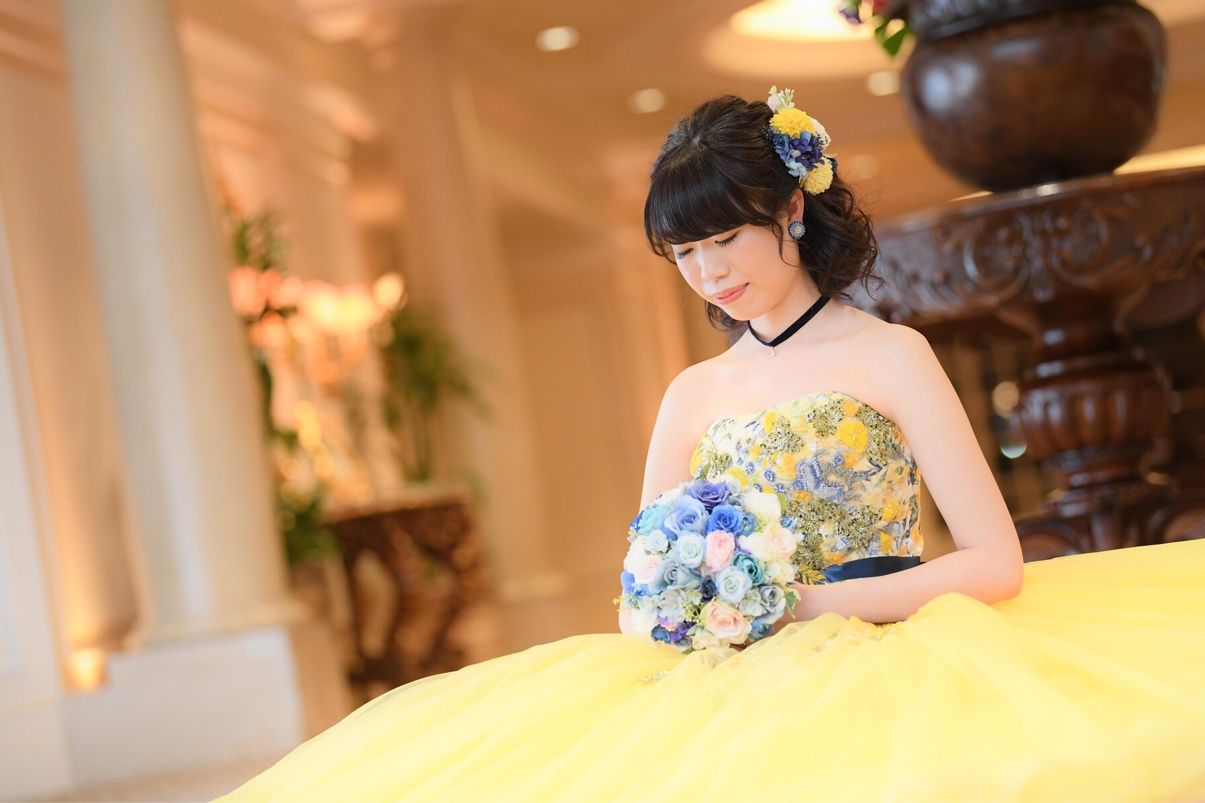 胸元の刺繍とビーズがとても可愛くて色合いが華やかで、夜挙式に映えるかなと思いイエローミルトニアにしました!