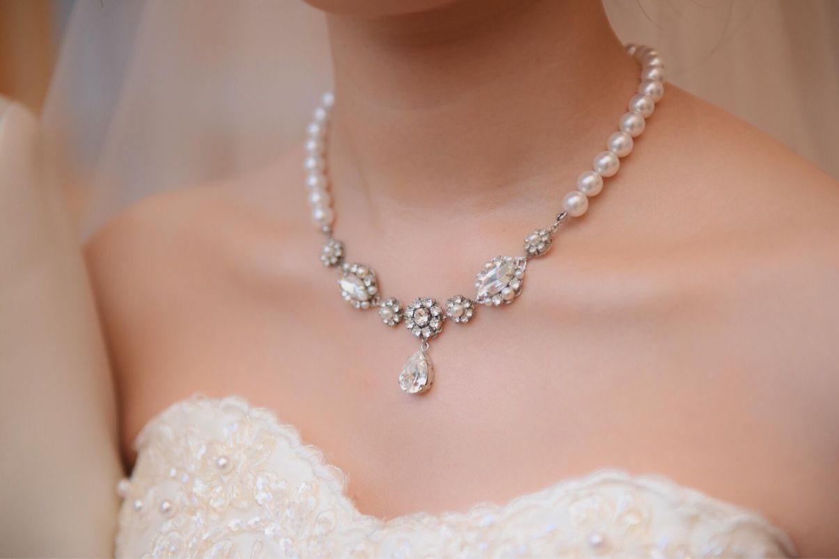 ウエディングドレスはパールとストーンのネックレス、大きめストーンのイヤリング。