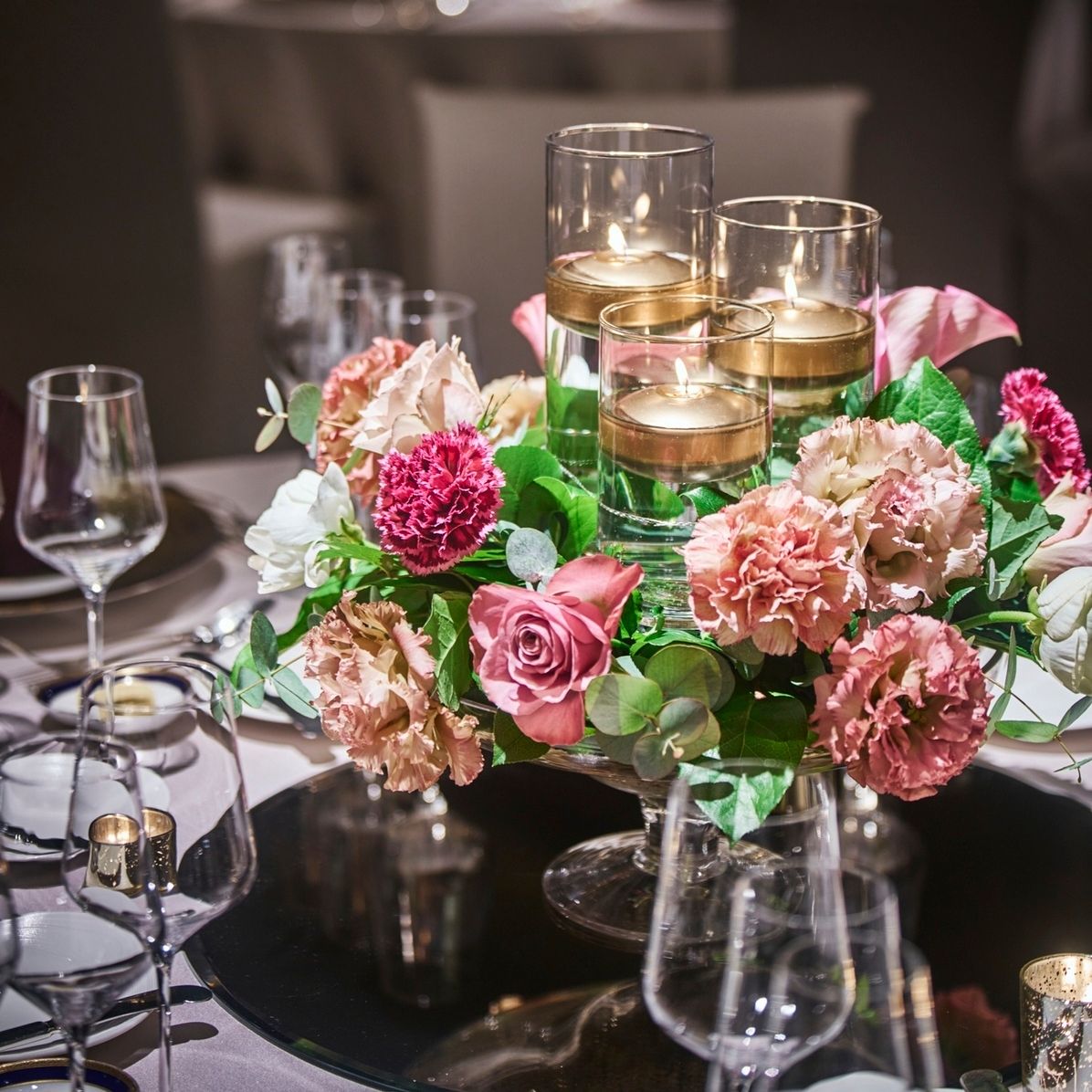 お花の種類には特にこだわりがなかったので、小さい花より大きい花、ピンクの中でもアンティークピンクの使用、エンジ色で全体を締める、ゴールドのキャンドルをたくさん使いたいという希望をお伝えしています。