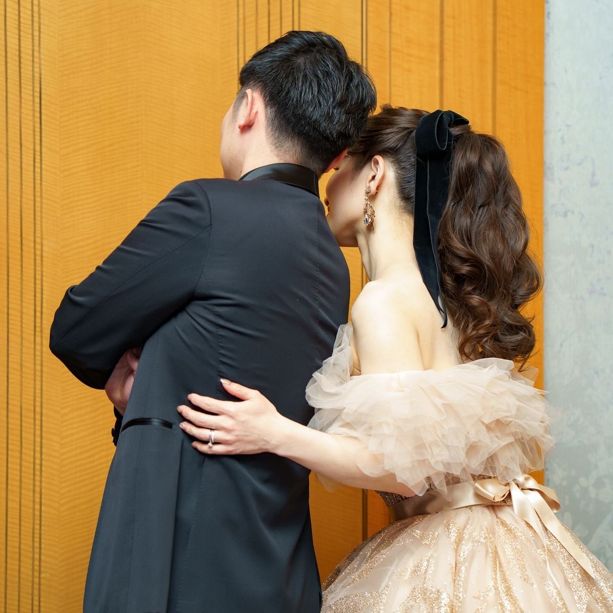 ポニーテールでは黒のベロアリボンをつけました。ドレスのベージュの淡さを引き締めたかったことと、冬婚だったこともあり黒のベロアを選んでいます。