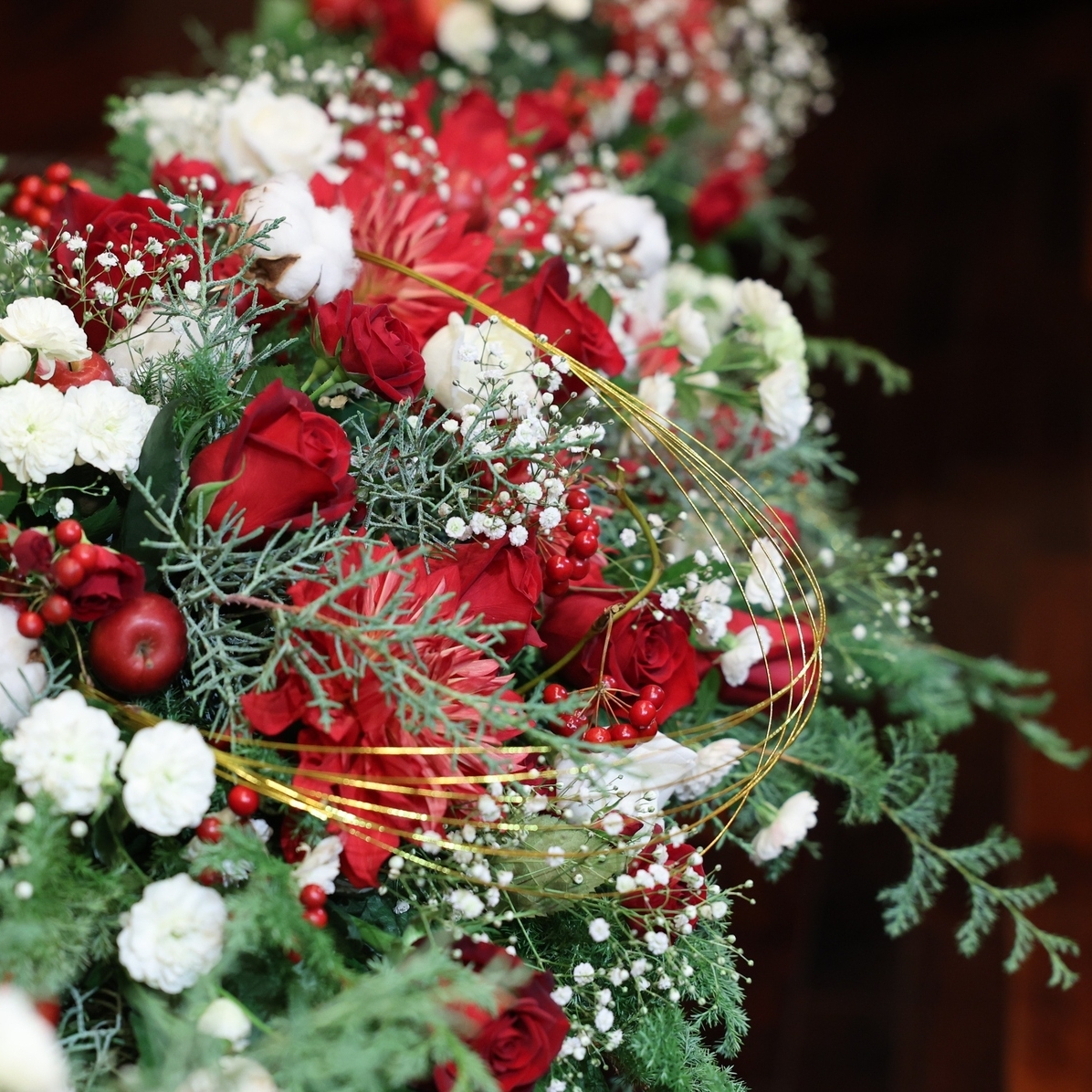 装花はHanahiroさんにお願いし、赤・白のお花を中心にクリスマス感のある雰囲気にしてもらいました。ゴールドのキャンドルや松ぼっくり、コットンフラワー等で季節感を出したのもポイントです。