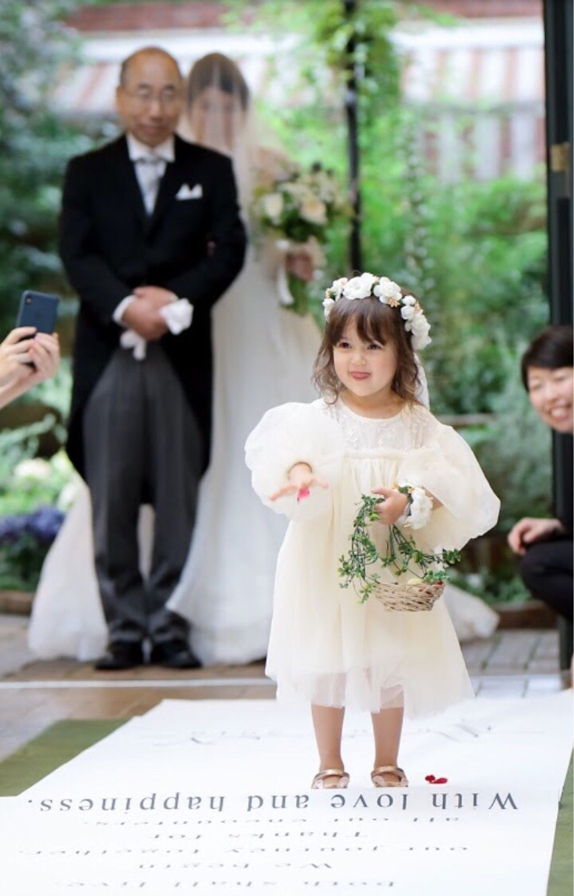 ・友人の子3歳の女の子に、新婦入場の前に1人でフラワーペタルでバージンロードを清めながら歩くという重要ミッションをお願いしていました。