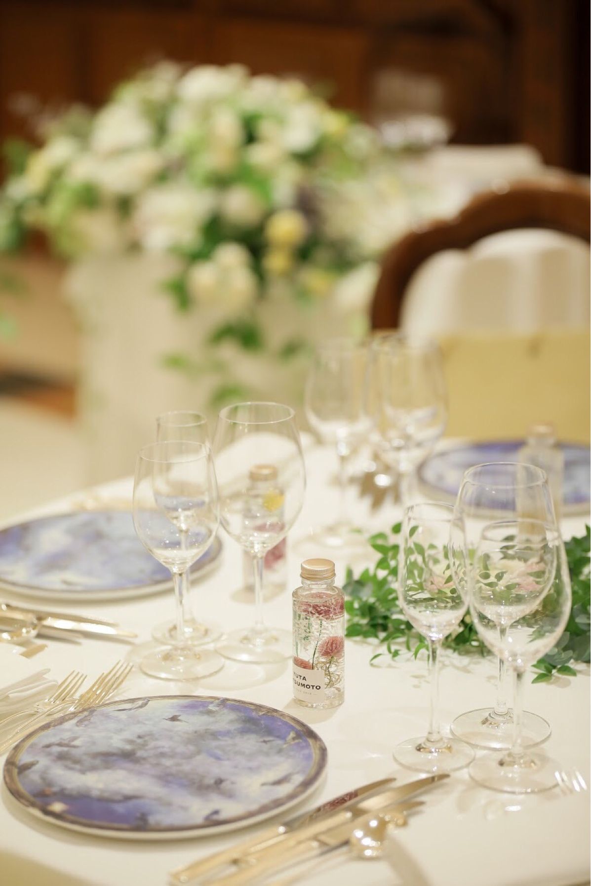 ・プチギフトを引菓子に踏襲したため、 席札を持ち帰ってもらえるものにとハーバリウムにしました。 元々席札に手紙を書くことをやりたくなく(笑)、でもきちんとゲスト一人一人へ想いを込めて、想いの伝わるよう手作り。 お見送り時に、男性ゲストからもどんなイメージで作ってくれたんですか?と質問を多くいただけました(笑)