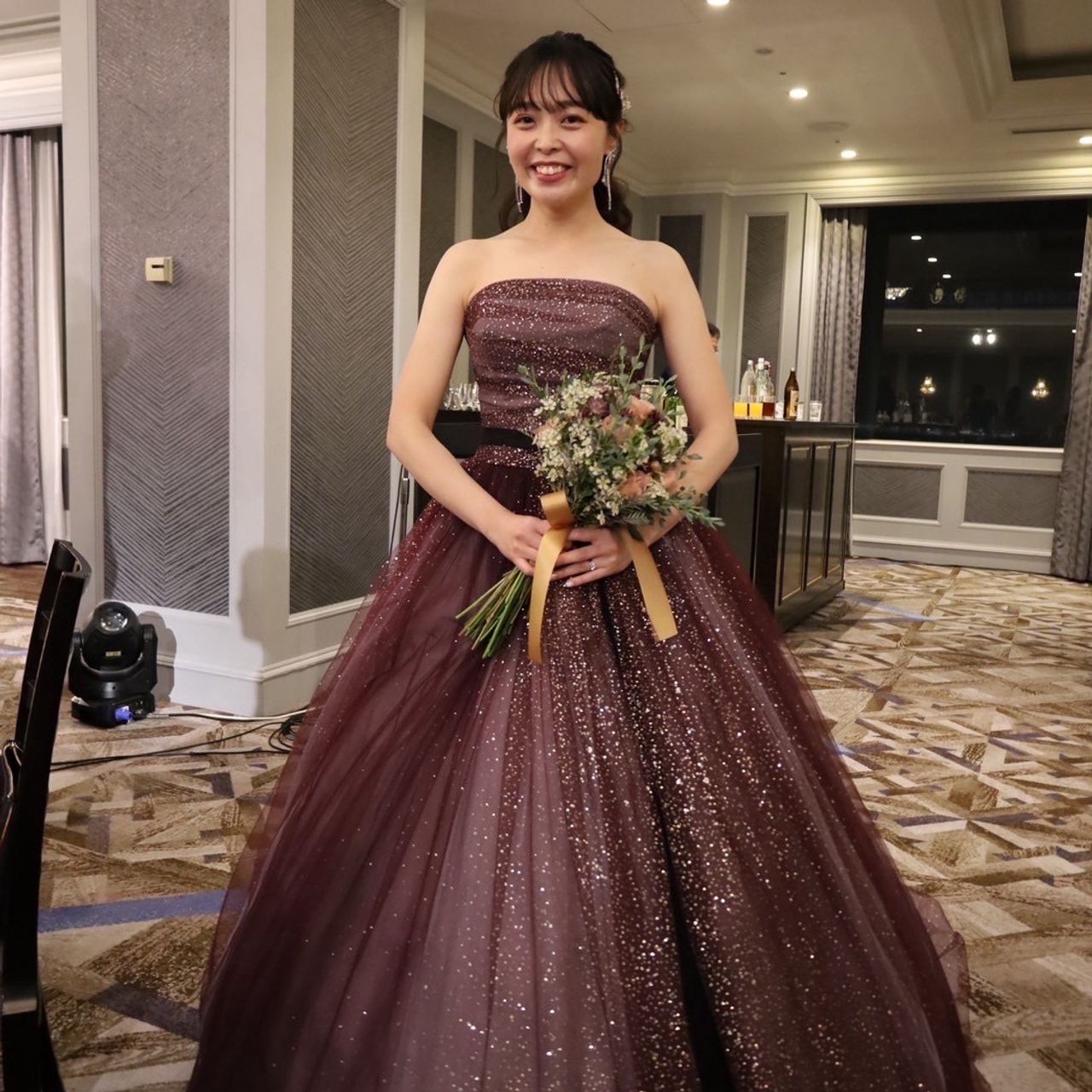 Wine Pieris(ワイン・ピエリス)という、試着して一目惚れしたドレスです。上品なのにとてもキラキラしていて、華やかなところが会場の雰囲気に合うと思い、選びました!