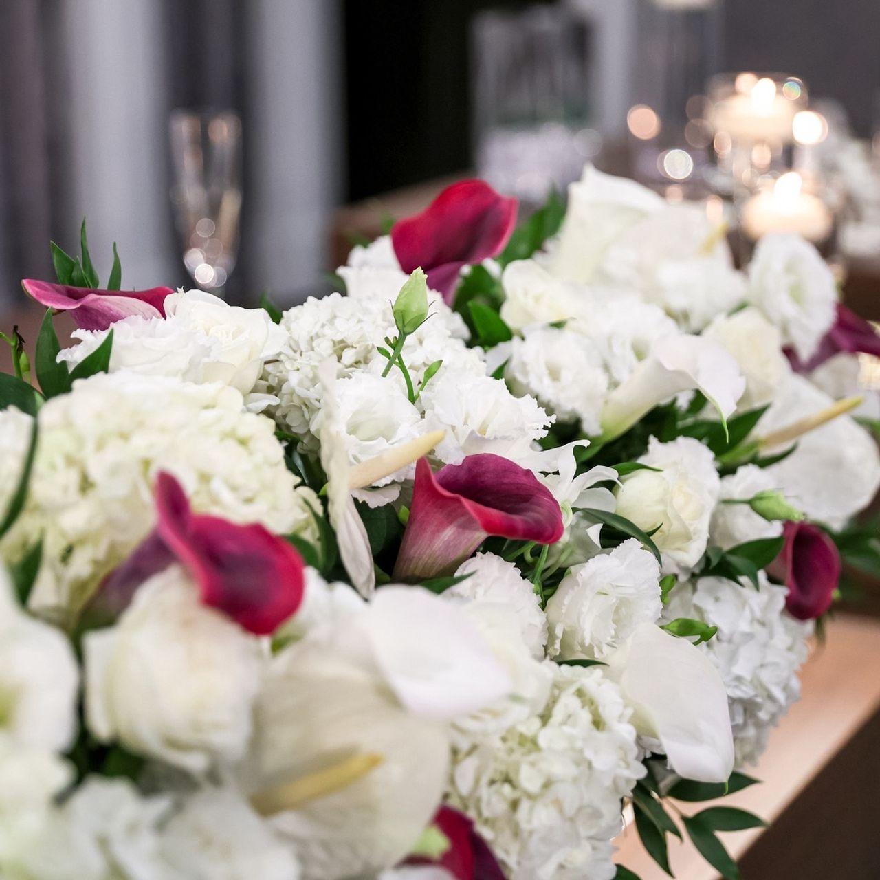 白を基調とした色々なお花(薔薇・マリーゴールド等)をメインに、アクセントで紫を入れました。大好きなアンスリウムも入れて、上品さが際立つようなテイストにしたことがポイントです。また、ウェディングドレス、カラードレスにも合うよう意識しました。