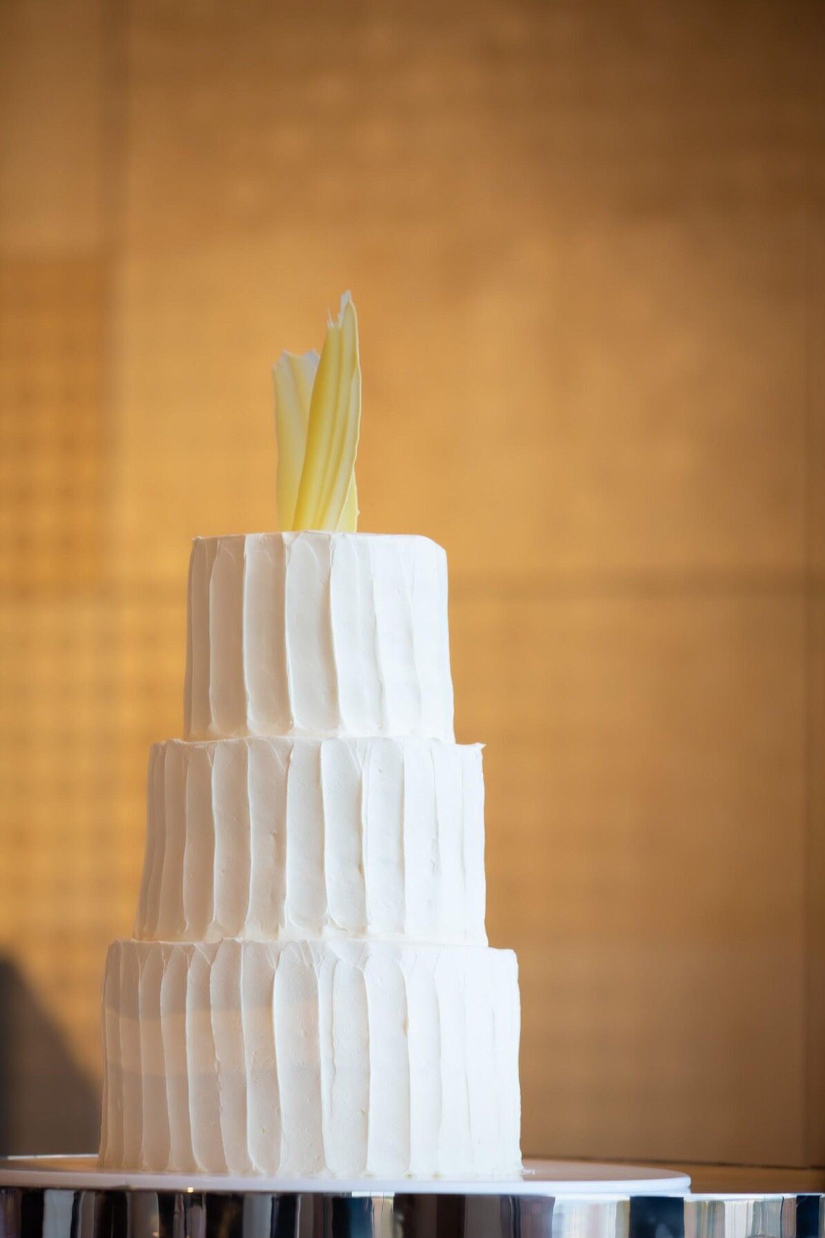 ホワイトのシンプルな三段ケーキに、私たち二人をイメージしてトップにホワイトチョコレートのデコレーションをしました。